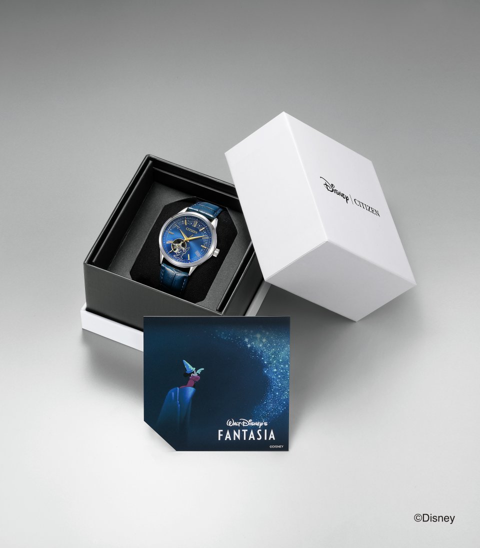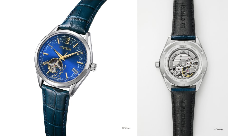 『シチズンコレクション』は『ファンタジア』の世界を表したメカニカルペアモデル。オープンハートにかかるように描いた、特徴的な帽子をかぶったミッキーのシルエットから、美しい夜空のようなネイビーブルーの⽂字板にミッキーの魔法が輝きます。