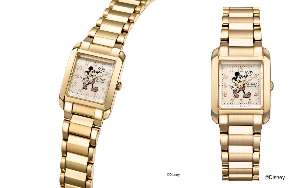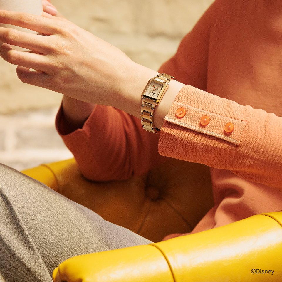 「ミッキーマウス」を⽂字板中央にプリントした『シチズン エル』は、定番のスクエアモデル。ウォームゴールドのケース、ピンクベージュの⽂字板と相まって、レトロな雰囲気にあふれています。