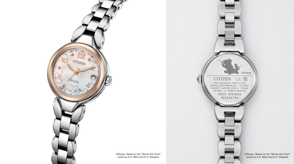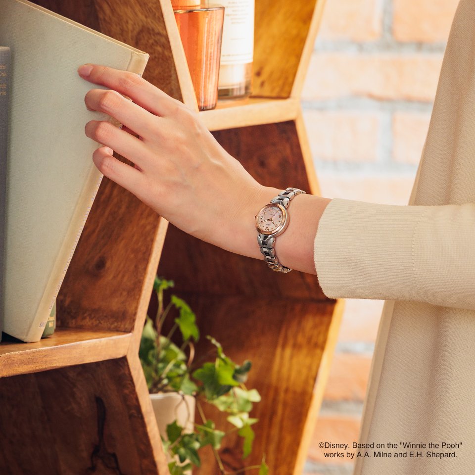 『シチズン エクシード』は、人気が⾼いフラワーバンドモデルをベースに「くまのプーさん」を表現しました。プーさんのイメージに合うアラビアンインデックスを配した白蝶貝の⽂字板には、たんぽぽの綿毛がふわふわと漂い、6 時位置に昼寝中のプーさんがいます。