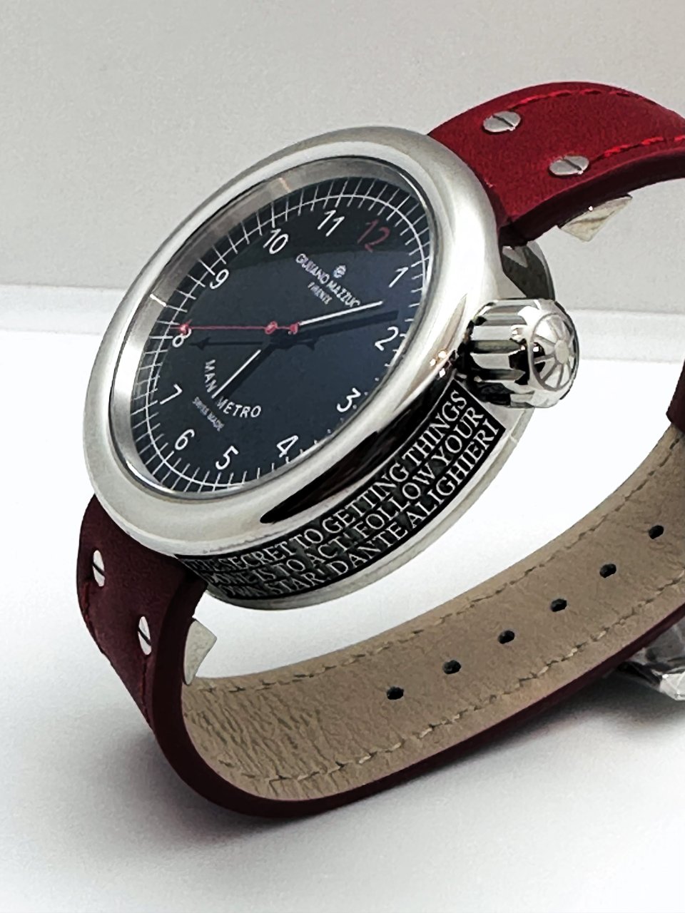 本モデルは他のマノメトロ同様、フィレンツェでデザインされ、スイス製自動巻きムーブメントを搭載。ケースのエングレービングはフィレンツェで最高水準の技術により施されます。ストラップにはトスカーナ産のフィレンツェ革を使用し、手縫いで仕上げられています。その深い赤は、中世において詩人や知識人の象徴とされた色であり、伝統的にダンテの肖像にも描かれてきました。