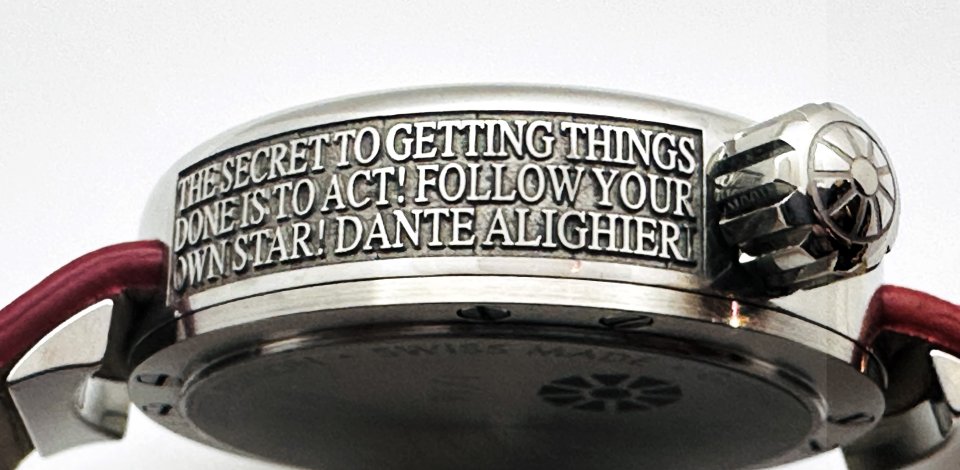 シリンダー形のケース側面には、ダンテの言葉として知られる格言が美しく刻まれています。
