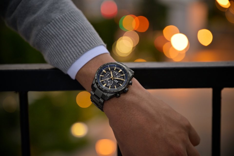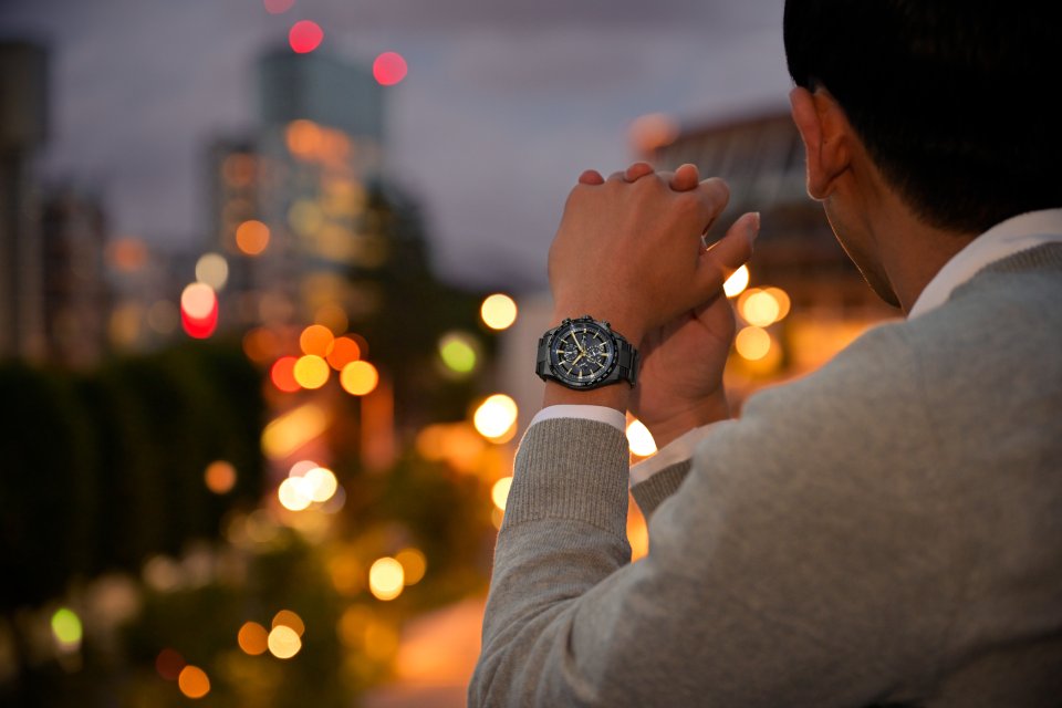 この文字板を囲むインジケーターリングには、「HTV-X」が羽のように展開するソーラーセルをイメージして深いブルーを採用しました。デュラテクト DLC[※1]を施した艶やかなブラックカラーが美しいスーパーチタニウム™[※2]のケースとバンドが、全体を引き締めます。