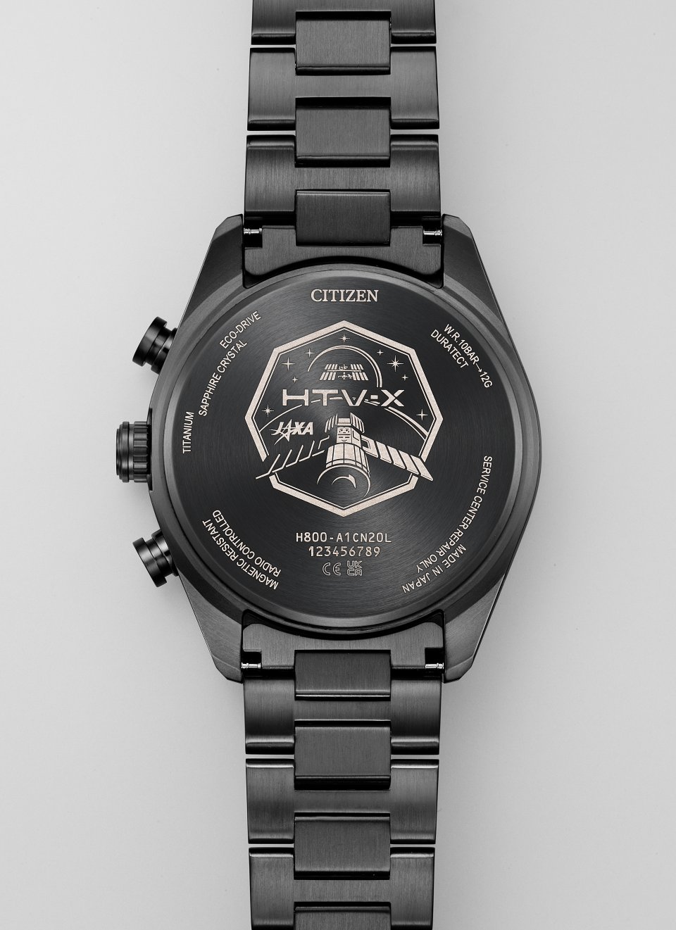 また、りゅうずのみの簡単操作で、世界26 時差の時刻とカレンダーを表示するダイレクトフライト[※3]や、世界4エリア(日中米欧)の標準電波を自動受信するエコ·ドライブ電波時計[※4]など、高い機能性も魅力です。裏ぶたには「HTV-X」のミッションマークを刻印しました。