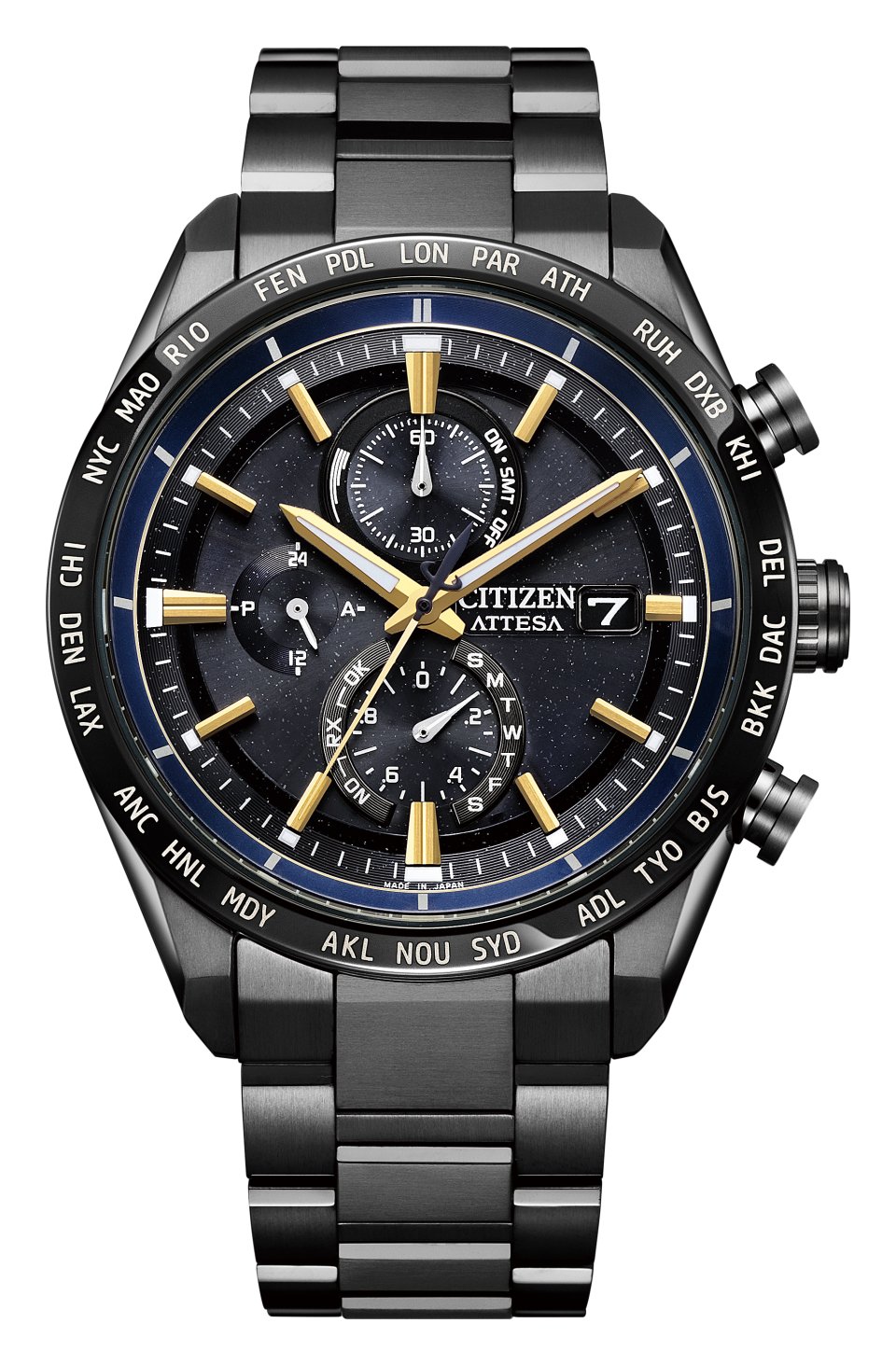 アテッサラインナップのなかでも高い人気を誇る ACT Line「AT8185-62E」をベースに製作。宇宙空間をイメージしたラメが輝くブラックの文字板上に、「HTV-X」のボディカラーに着想を得たイエローゴールドの針とインデックスが堂々とした存在感を放ちます。