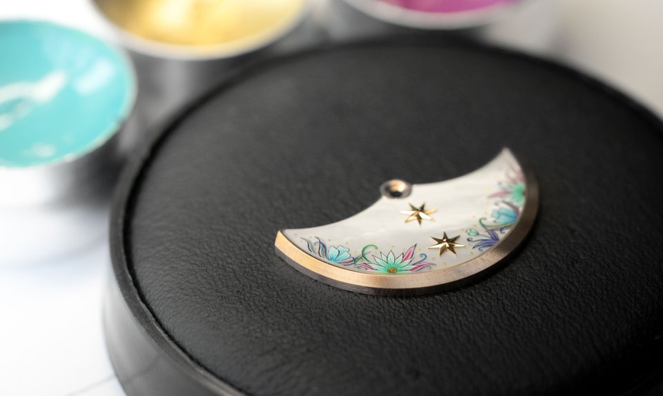 この絶妙なコントラストを引き立てるのが多彩な職人技です。カトリーナの頭部は細密画で、文字盤の左側にある花の台座は"高温焼成"エナメル仕上げとなっています。1.1 mm 厚のゴールド製の文字盤には手作業で葉のエングレービングが施されています。厚みの異なる葉にはさらにエナメルパウダーが充填され、数回にわたって焼成されています。