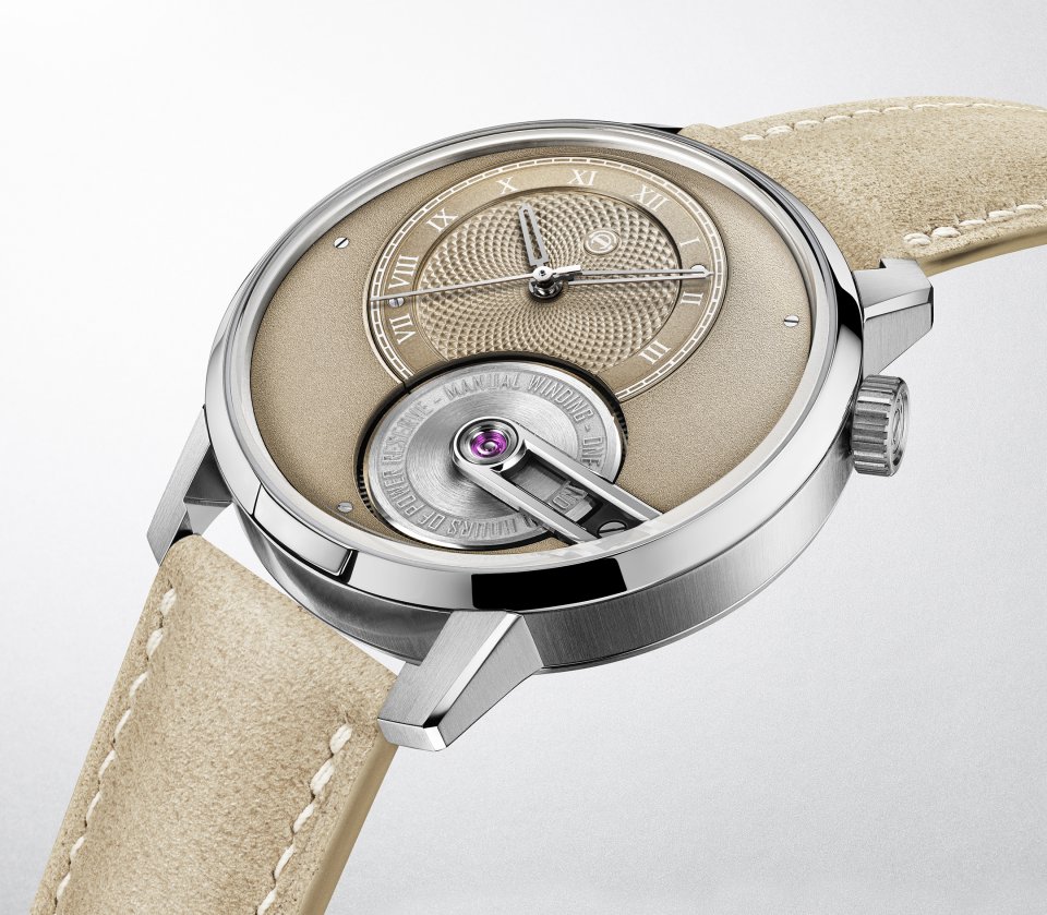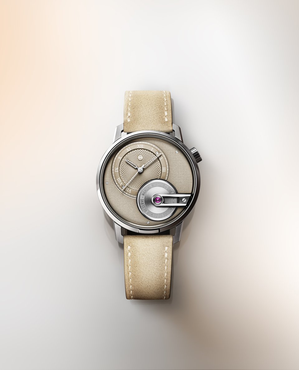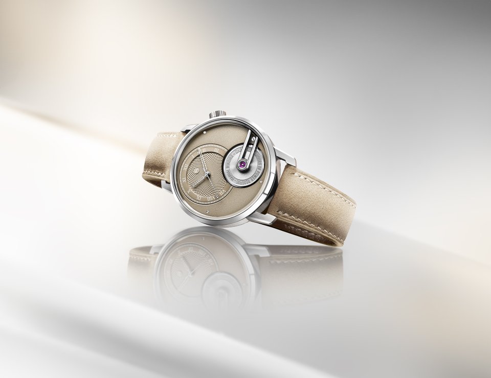 オフセンターに配された砂色の文字盤には、グラン・ドルジュ(大麦の粒)模様のギョーシェ装飾とローマ数字が刻まれ、フロステッド仕上げのサブダイヤルが調和を添えます。
