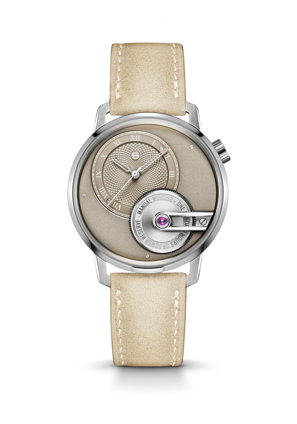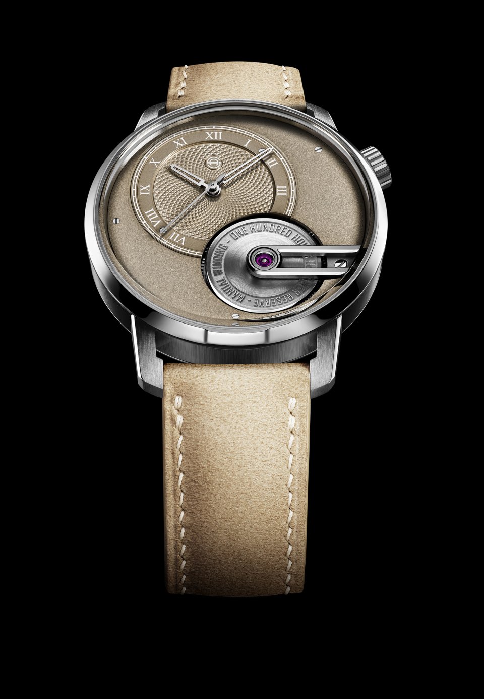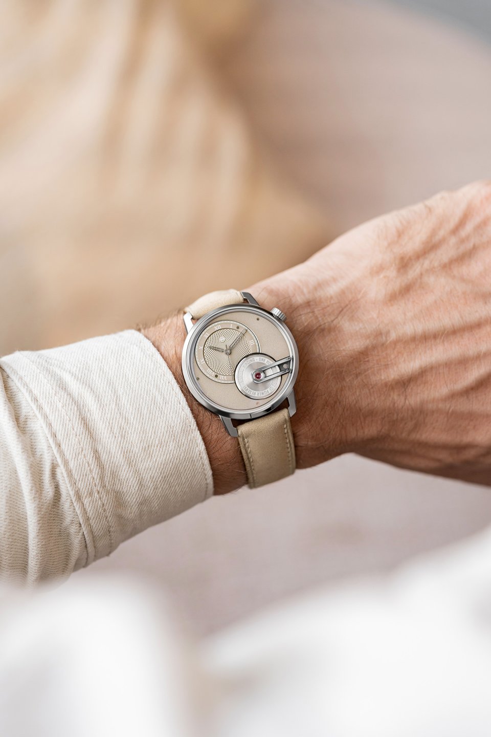 オフセンターに配された砂色の文字盤には、グラン・ドルジュ(大麦の粒)模様のギョーシェ装飾とローマ数字が刻まれ、フロステッド仕上げのサブダイヤルが調和を添えます。