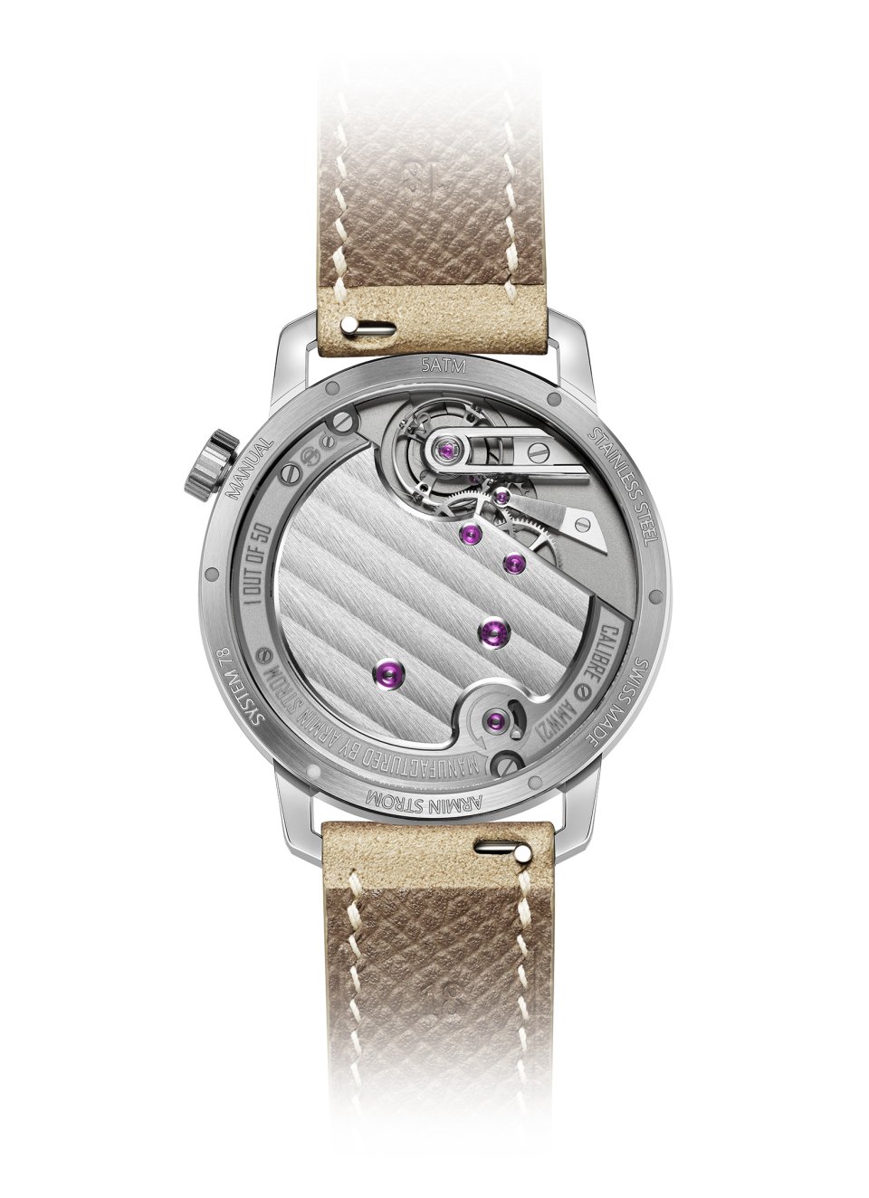 搭載するのは自社製手巻きキャリバーAMW21。アーミン・シュトロームが追求する「メカニカルなエレガンス」を体現するムーブメントであり、約100時間という長時間パワーリザーブを誇ります。