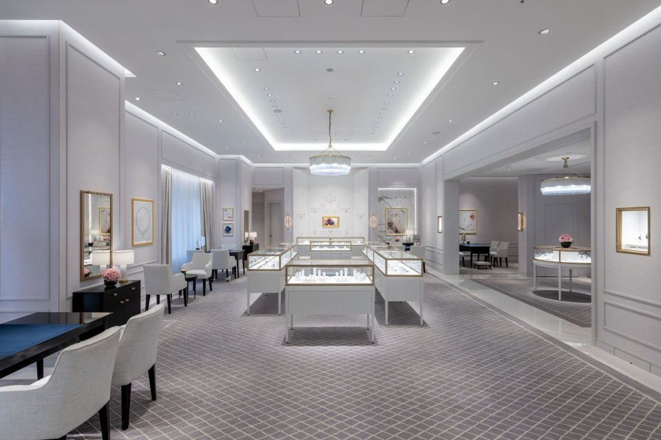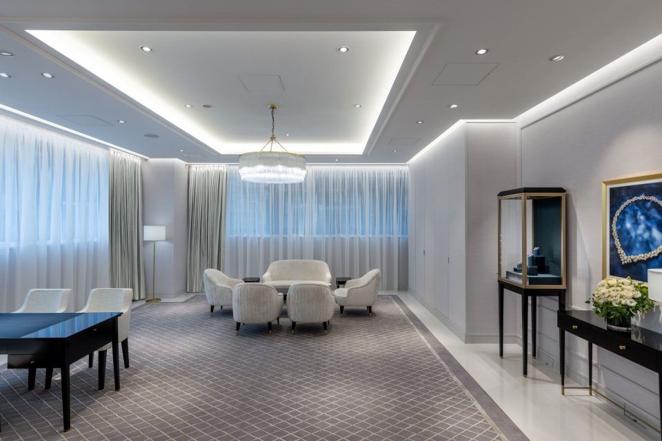 新しいサロンでは、インテリアのあらゆるディテールがブランドの永続的なレガシーを物語ります。床を取り囲むのは、繊細にカットされ磨きあげられた白い大理石で、カスタムメイドのカーペットが温かさと質感を加えています。壁は光沢のある白い壁紙と大理石で仕上げられ、全体に輝くような効果をもたらし、重厚なシャンデリアと厳選されたファニチャーが、雰囲気を完成させています。