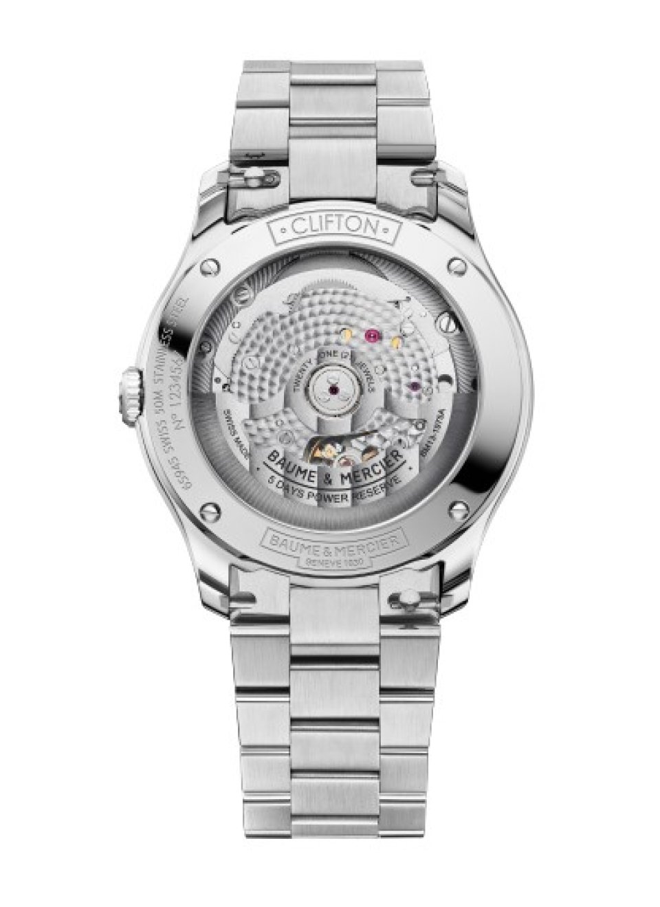 すべてのモデルはサファイアケースバックで、美しいムーブメントの織りなすスペクタクルを見ることができます。パール仕上げのブリッジ、サンドブラストとスネイル仕上げの地板。ローターはゴールドカラーでスケルトンを加え、コート ド ジュネーブ装飾とスネイルで仕上げられ、ユニークなボーム&メルシエのロゴがグレービングされています。
