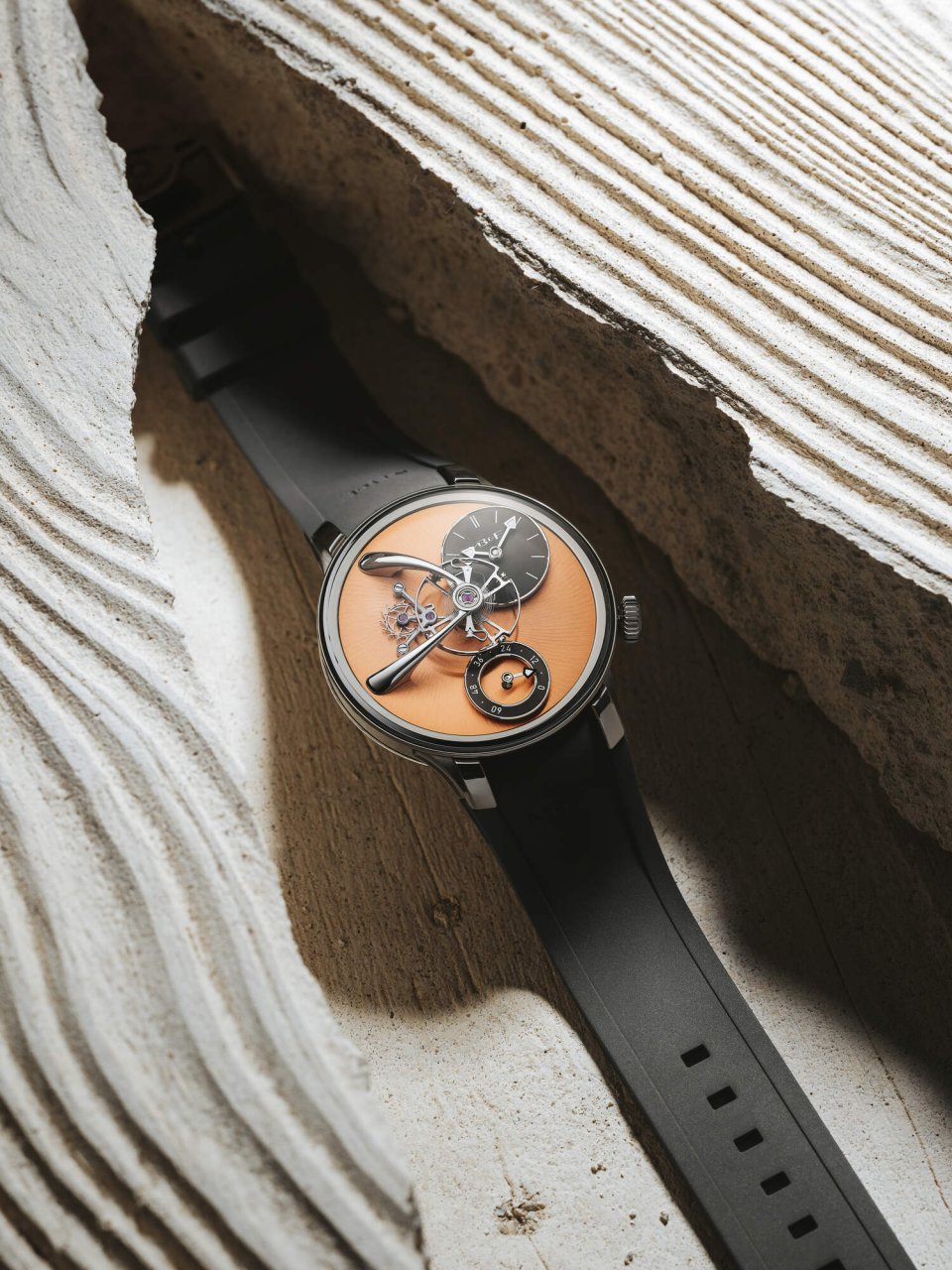 MB&Fの20周年を祝う2025年に、2モデルのLM101 エヴォ エディションが発表されます。いずれもチタン製ケースを採用し、サーモンまたはピーコックグリーンの文字盤プレートが組み合わされています。これらの文字盤のカラーはCVD(化学気相成長法)と呼ばれる技術によって仕上げられています。文字盤がムーブメントの構造の一部を成していることから、その技術的な利点を評価されて採用されました。ピーコックグリーンのバージョンは、グリーン、ブルー、パープルの光が表面で反射し、移り変わる色合いが特に魅力的です。サーモンバージョンは、MB&Fでは比較的珍しい色であるため、同様に注目に値します。