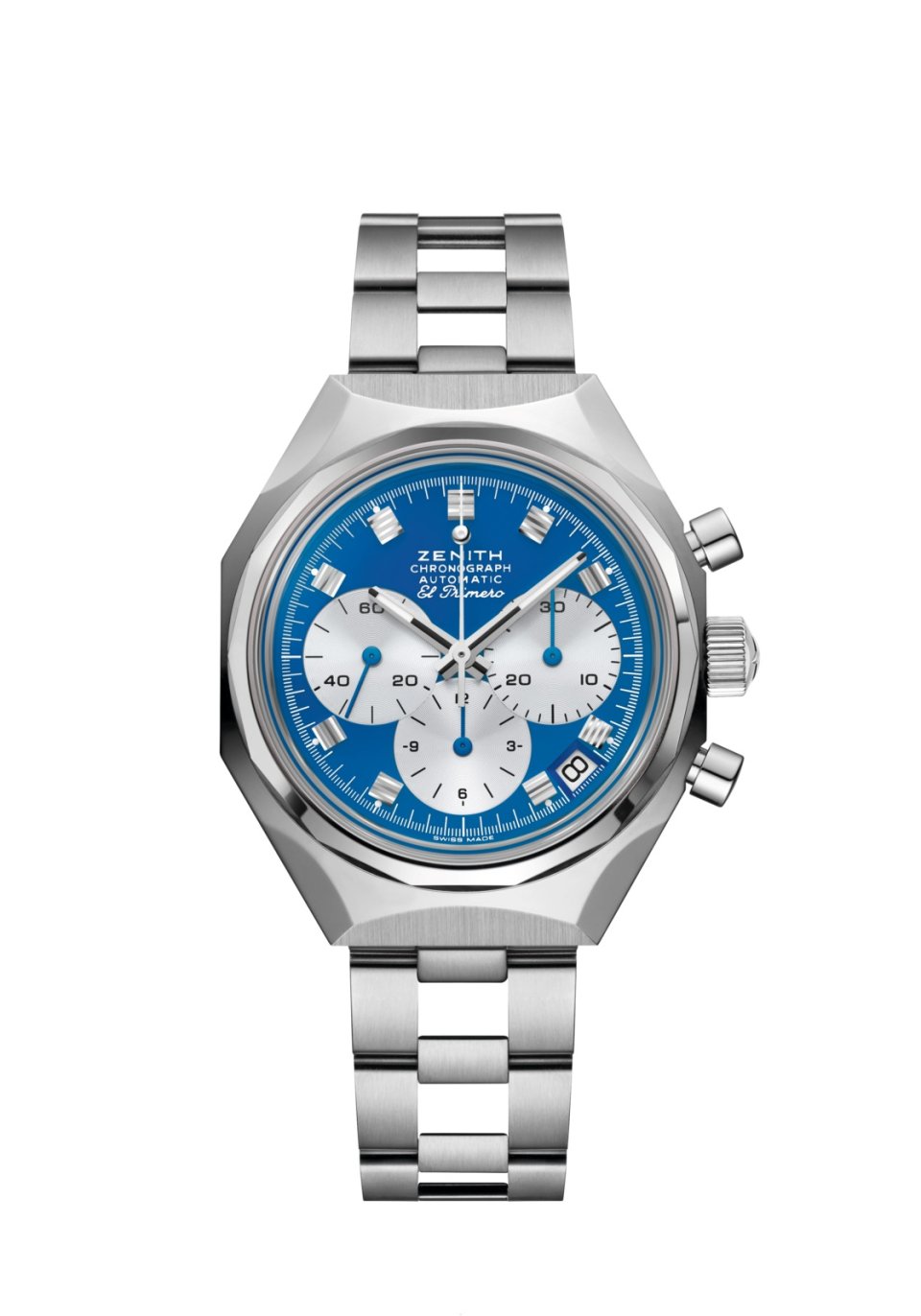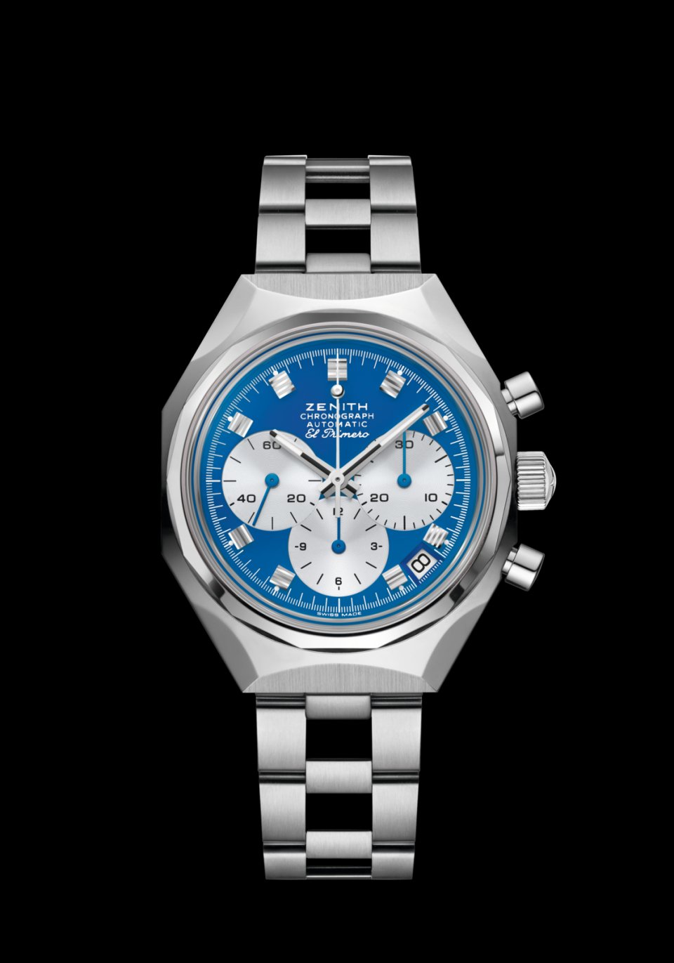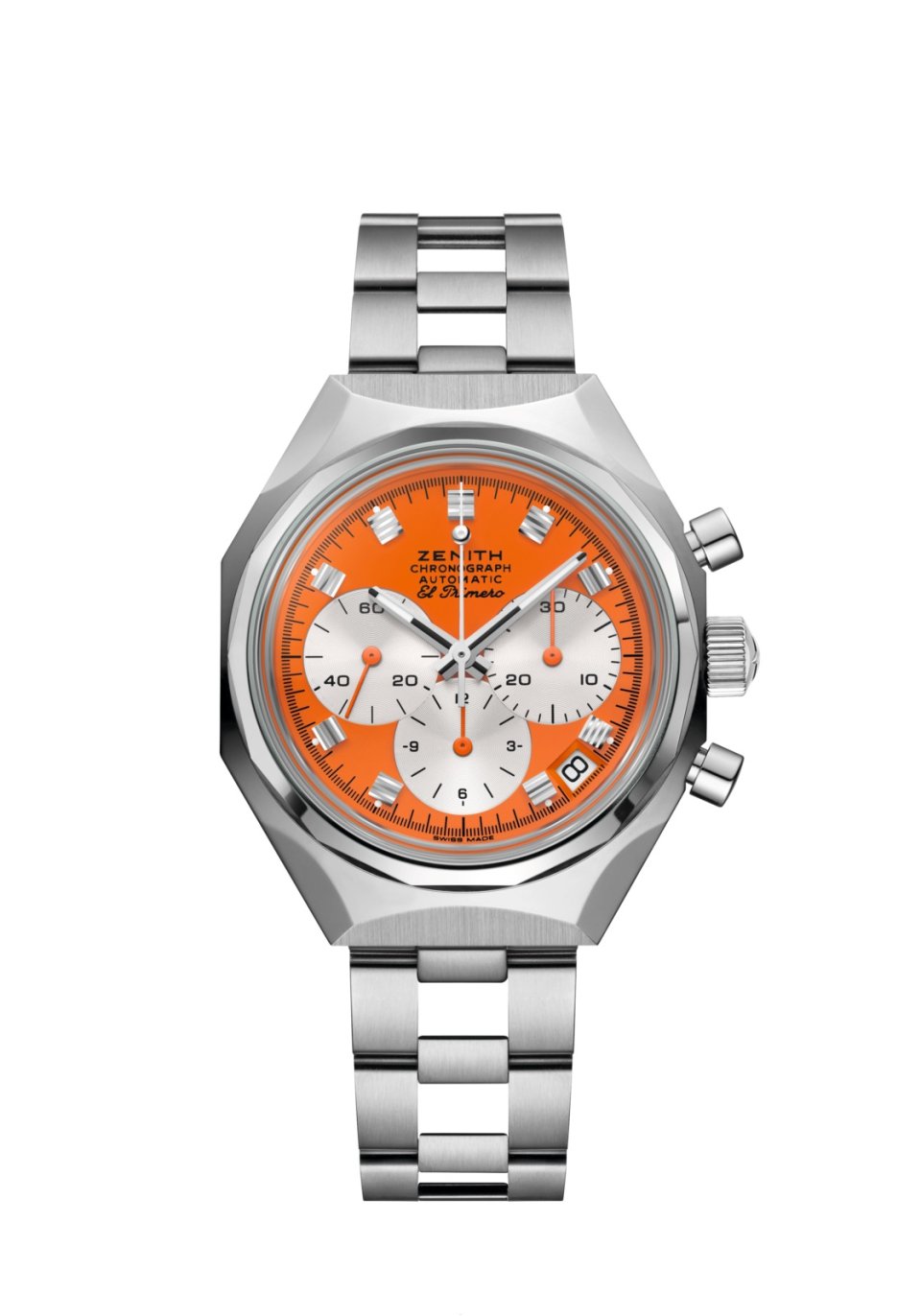 [特長]エル・プリメロ3針ウォッチ。高振動クロノグラフ。シリコン製のアンクルとガンギ車。ねじ込み式リューズ。