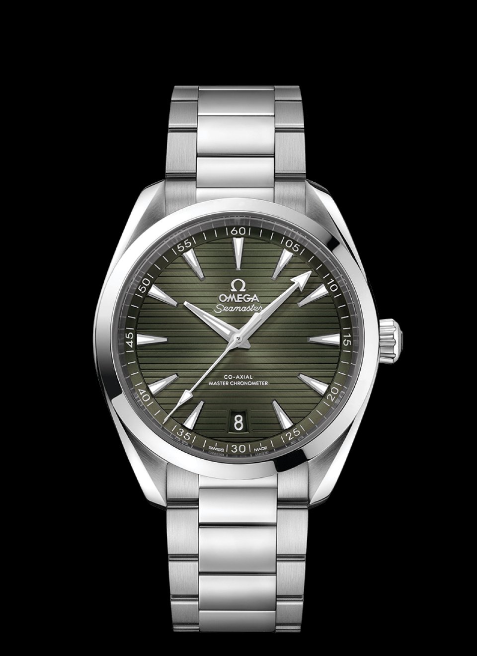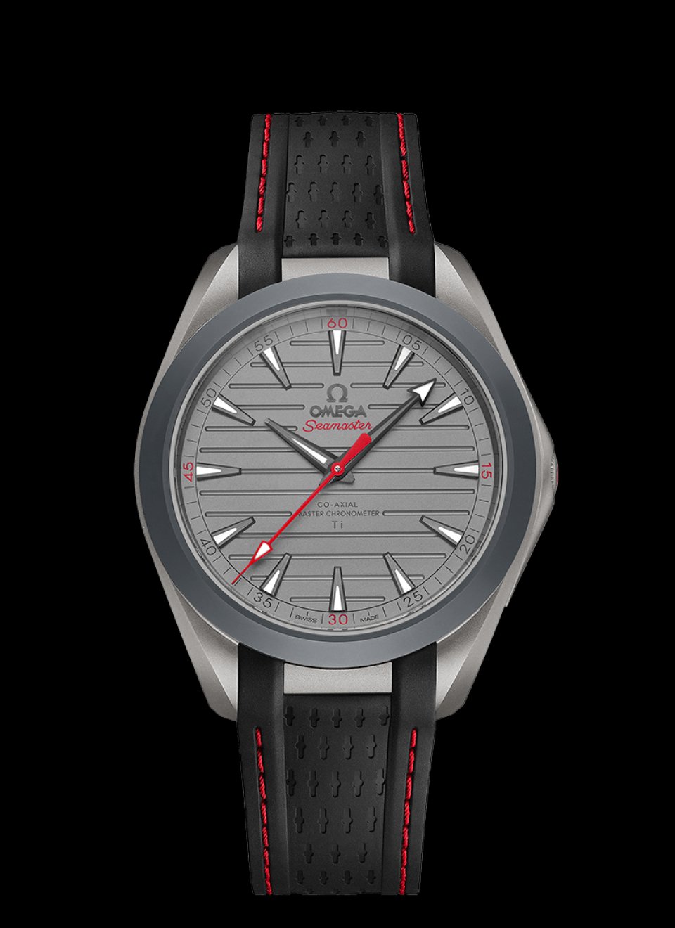 マット仕上げのアクアテラは、アルミニウム製の秒針とシーマスターのロゴ、15分毎のインデックス、ストラップのステッチに大胆なカラーを配色しています。カラーバリエーションはレッド、グリーン、ブルーの 3色から選べます。