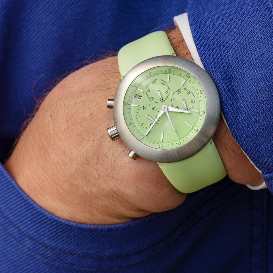 特徴的なくすみ感のある柔らかいピスタチオグリーンのクロノポッドは、世界限定50本のレアモデル。僅か50本の限定であることを証明するシリアルナンバー入り。