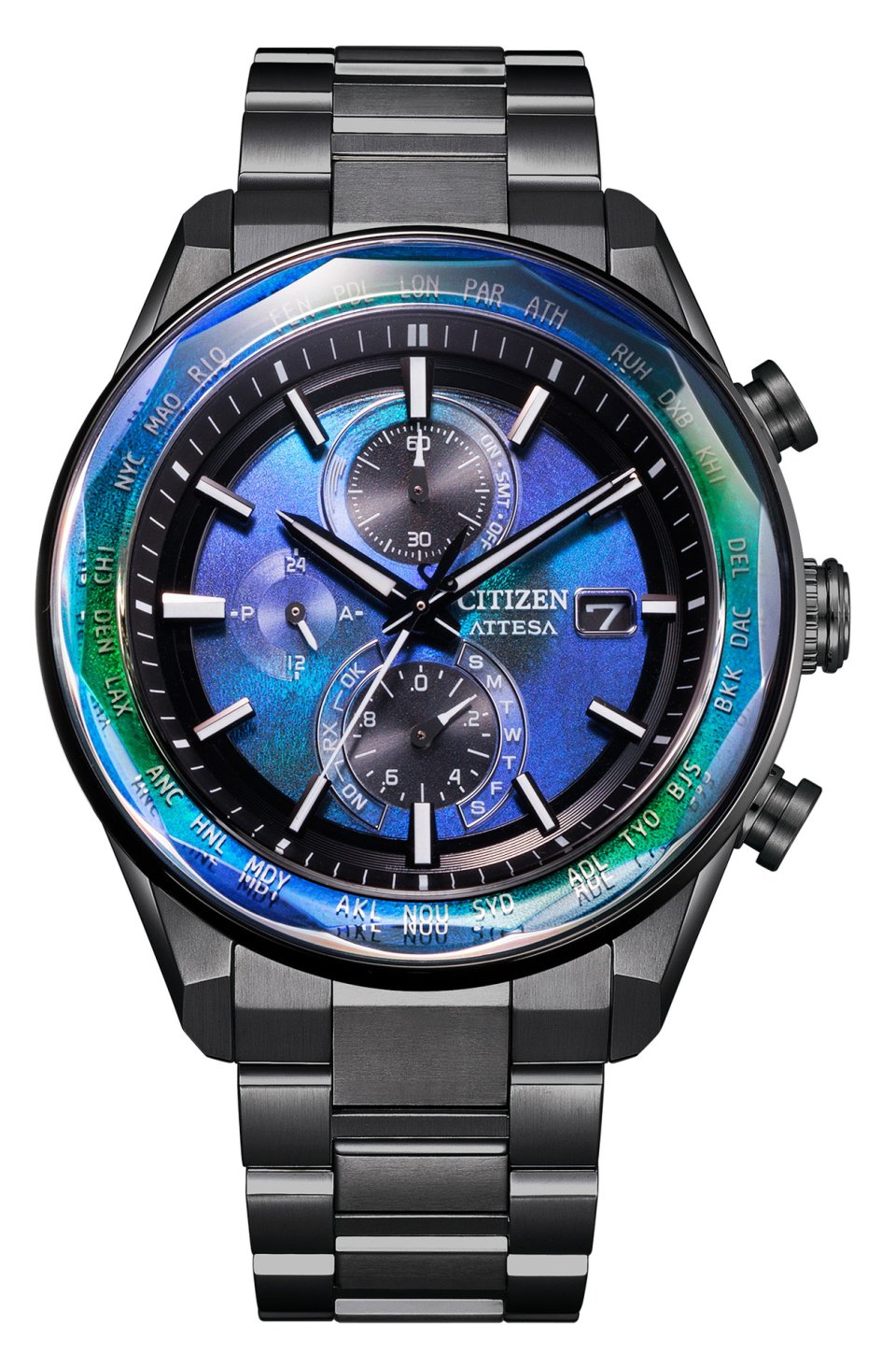 本モデルは、アテッサラインナップで⾼い人気を誇る ACT Line「AT8185-62E」をベースに、サファイアベゼルなどでアップグレードしました。「 AT8314-53L」は構造色文字板[※2]を用いた数量限定モデル。エッジを美しくカットしたサファイアガラスが、文字板からベゼル部まで覆う構造で、文字板だけではなくベゼル部まで構造色を使用することが可能になりました。