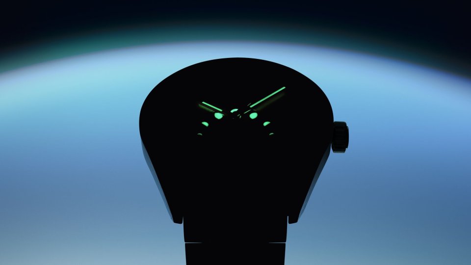 ブラックのフランジとブラックのムーンフェイズディスクが、宇宙の静けさを想起させる一方、ディープグレーのディテールが躍動感と独特な雰囲気を醸し出しています。また、ロジウムコーティングが施された針には、視認性を高めるホワイトのスーパールミノバ®が塗布されています。