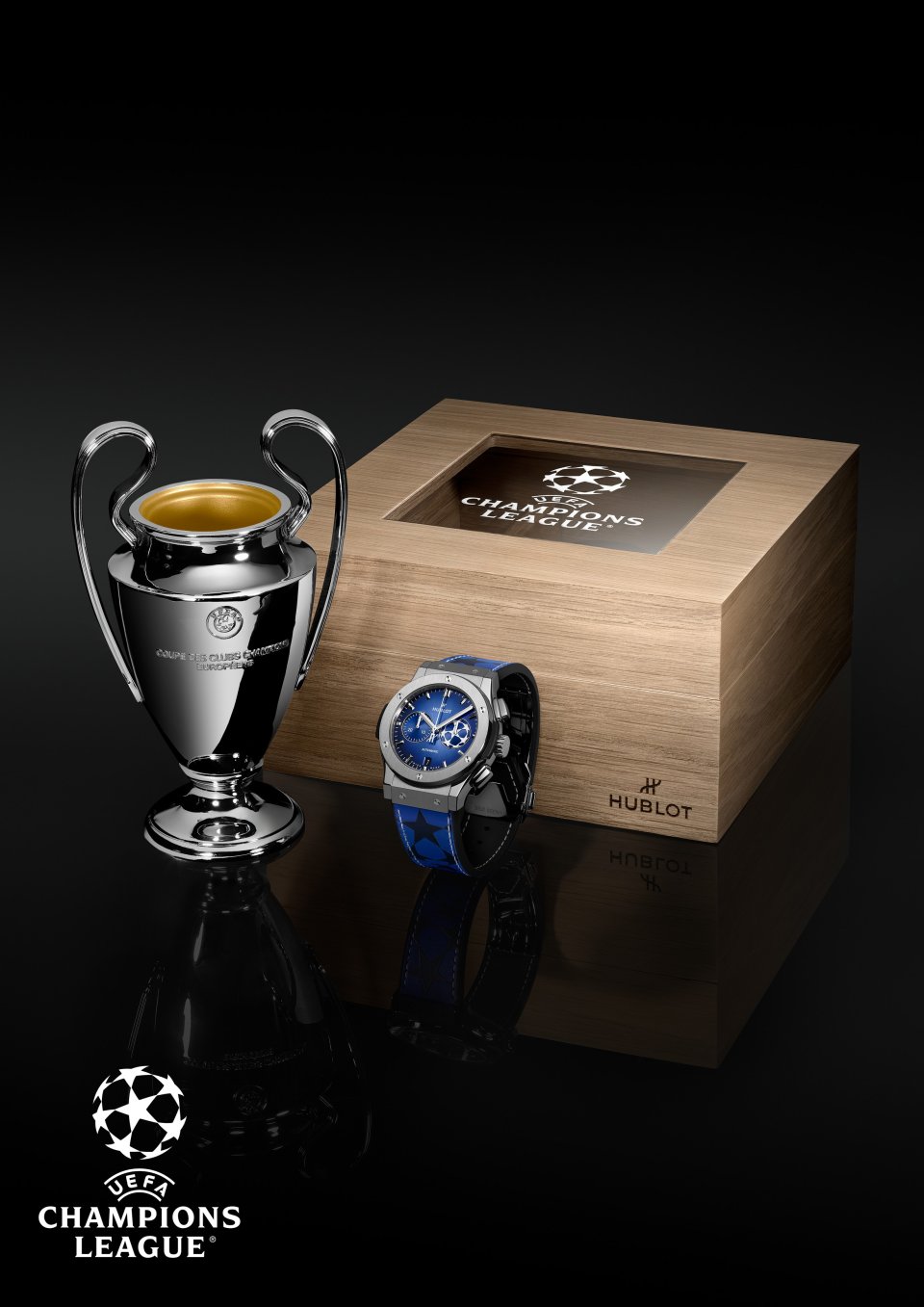 それぞれのタイムピースは、伝統ある大会にふさわしい 特注の木製ケースに収納されています。さらに、UEFAチャンピオンズリーグのトロフィーの公式ミニチュアが付属し、身に着ける度に勝者の気分を味わえることでしょう。