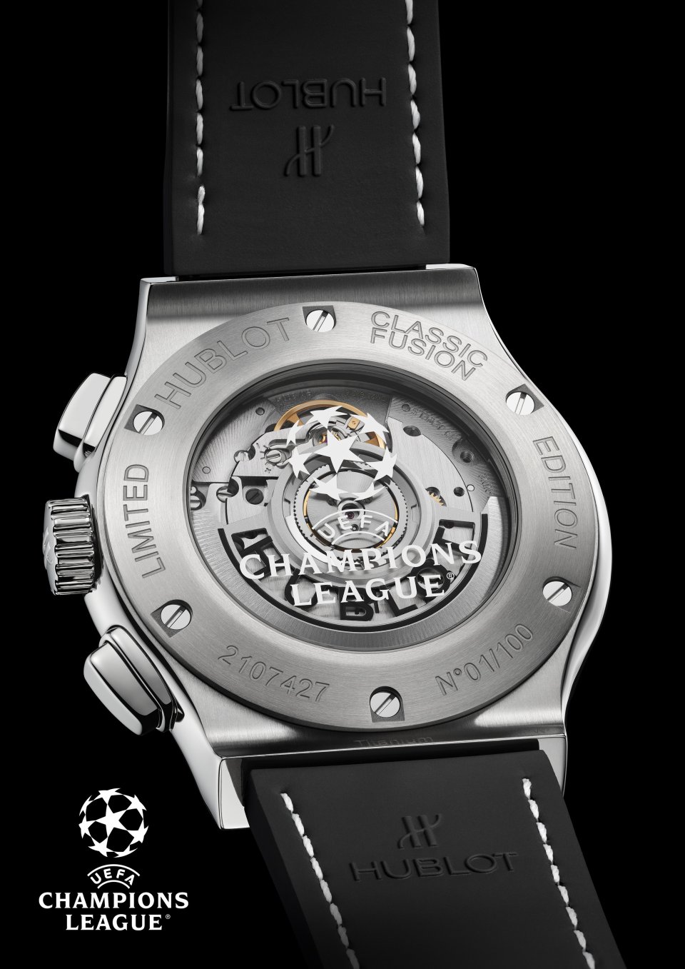 ・ケースバック:反射防止加工を施したサファイアクリスタル(UEFAチャンピオンズリーグのロゴ)