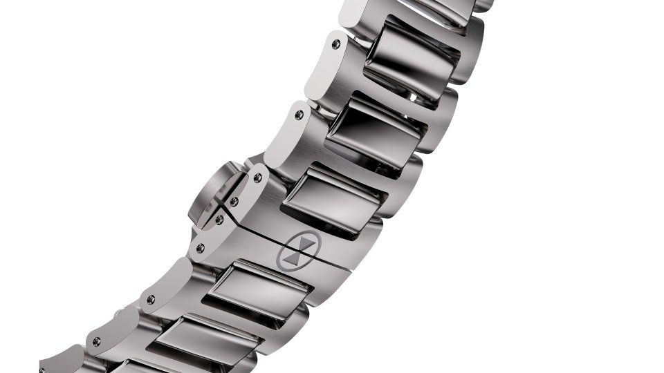 ブレスレットは一体型の2リンクスチール製で、ポリッシュとサテンの仕上げを組み合わせた仕様。