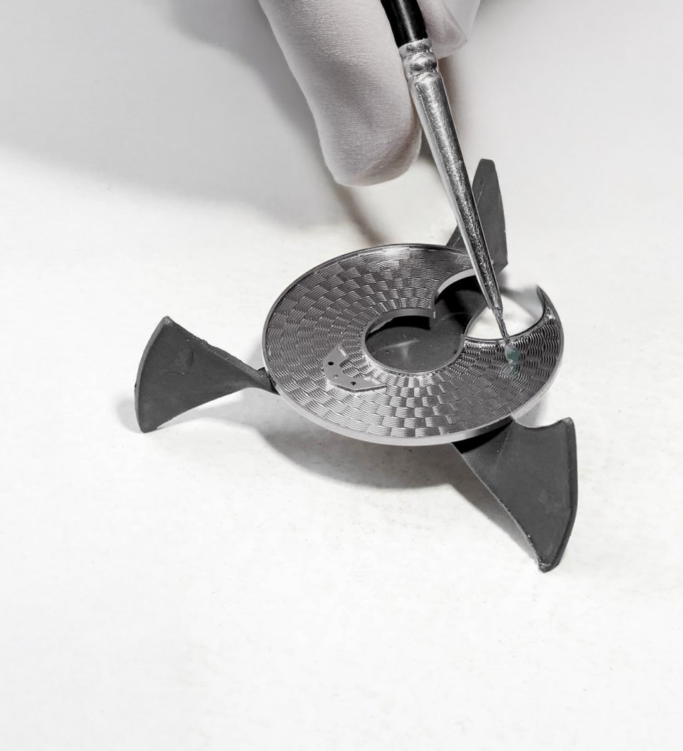 さらに、ディスクの素材には、熱安定性に優れたホワイトゴールドが厳選されています。この独自の組成により、プレートはエナメル加工で重要な工程である窯焼きに必要な極度の高温に耐えることができるのです。またディスクには、フリークXの象徴的な回転カルーセルの視覚効果を高めるギヨシェ・フランケパターンが刻印されています。
