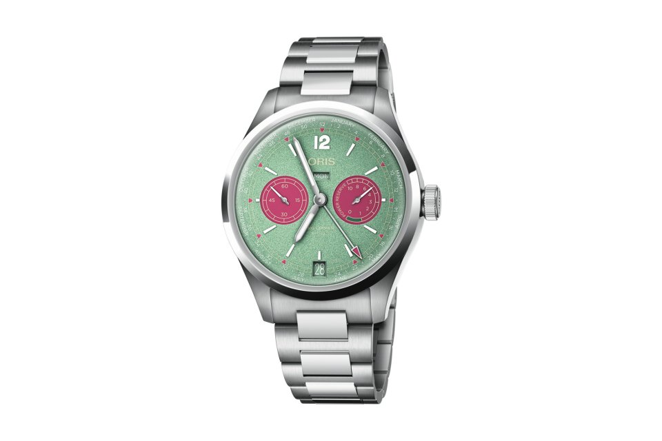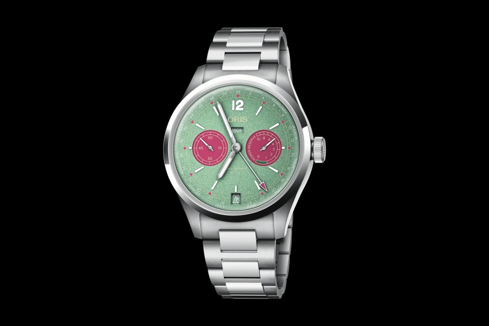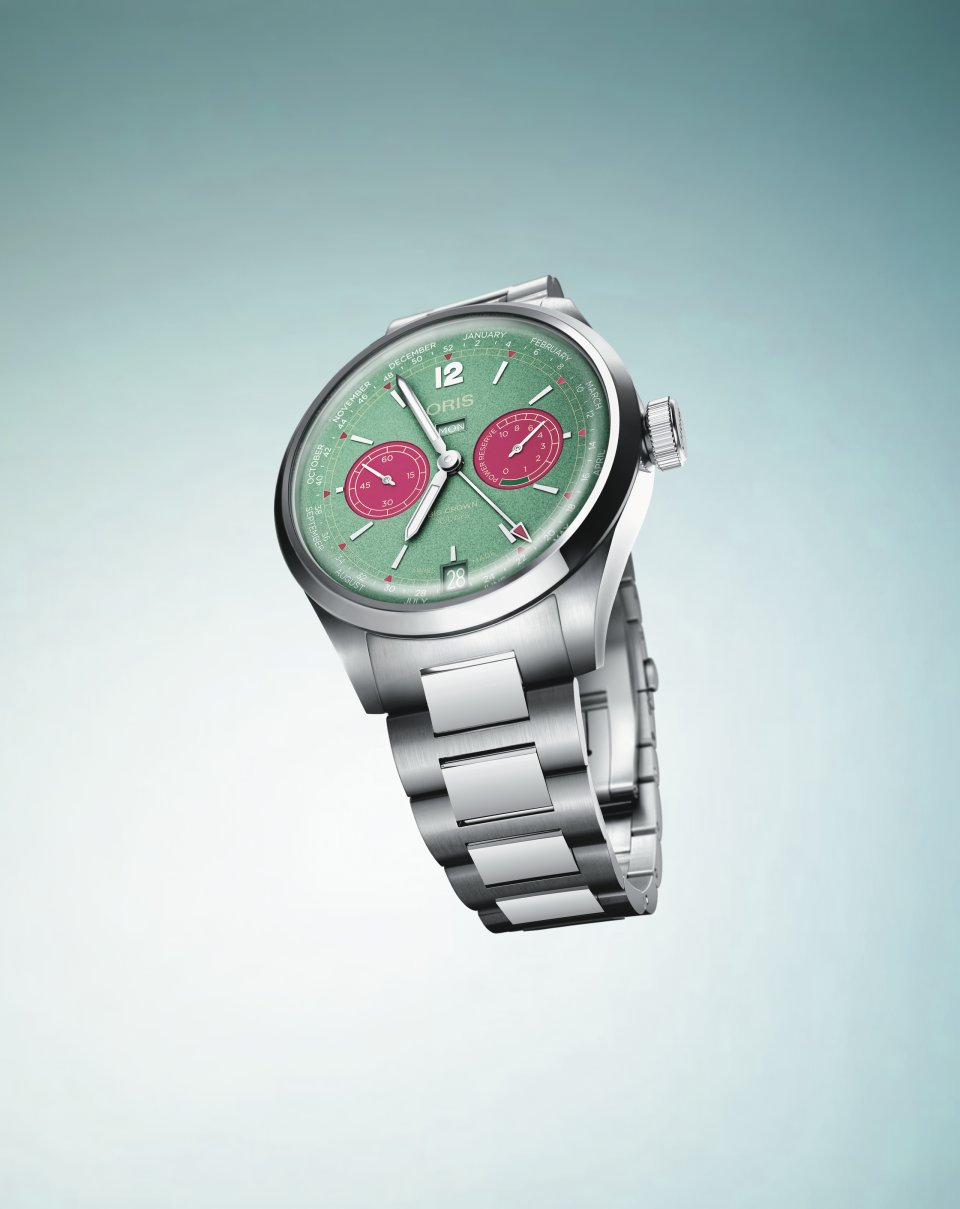 時計の機能の楽しさを引き立てるカラーも採用。文字盤のメインはミントグリーン、サブカウンターや一部の文字盤ディテールはローズピンクを採用。コントラストや視認性を考慮してゴールドやホワイトのディテール採用。柔らかくテーパードしたメタルブレスレットと組み合わせ、装着感も追求しています。