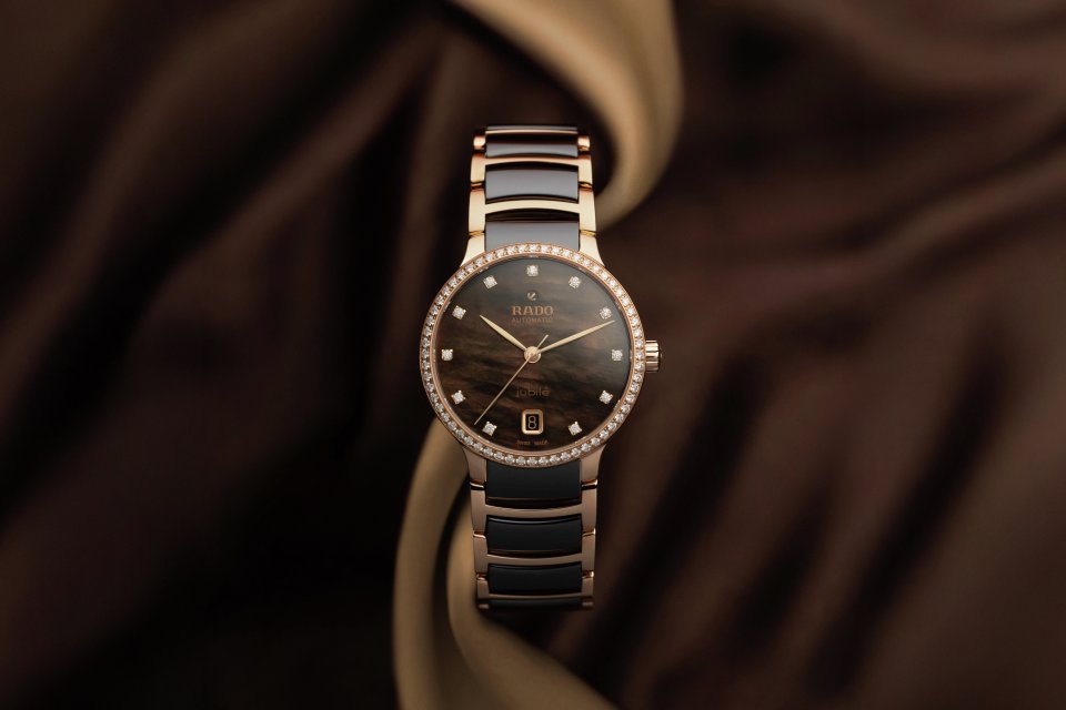 ケース、リュウズ、針、ブレスレットにはローズゴールドを採用し、モダンな印象を際立たせるカラーリングが特徴です。ブレスレットはダイヤルとの調和も意識したデザインで、ブラウンダイヤルにはポリッシュ仕上げのハイテクセラミック製ミドルリンクを、ライトシルバーダイヤルにはラドーが誇るプラズマハイテクセラミック製ミドルリンクを採用しています。