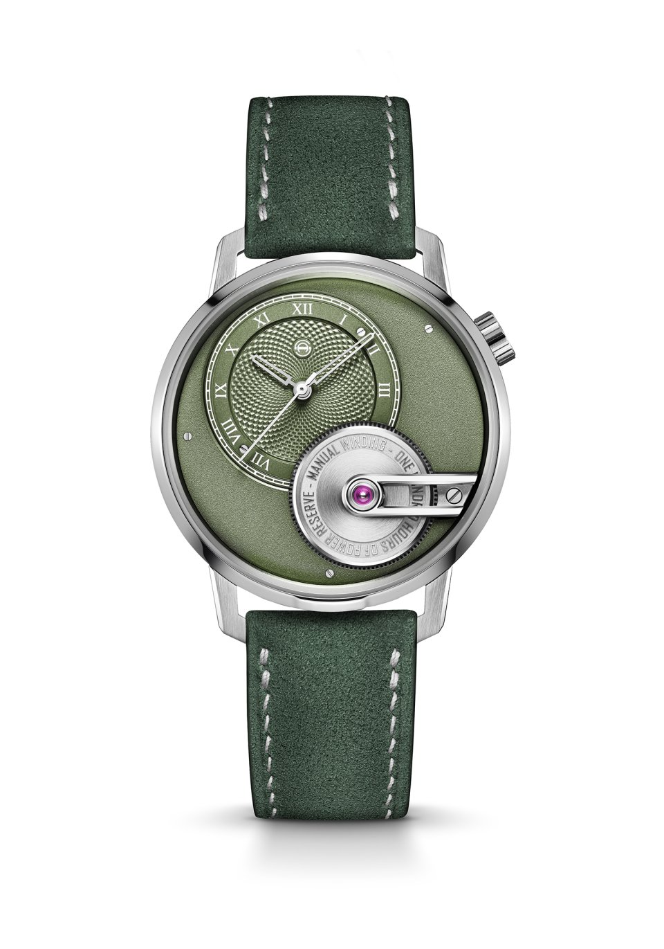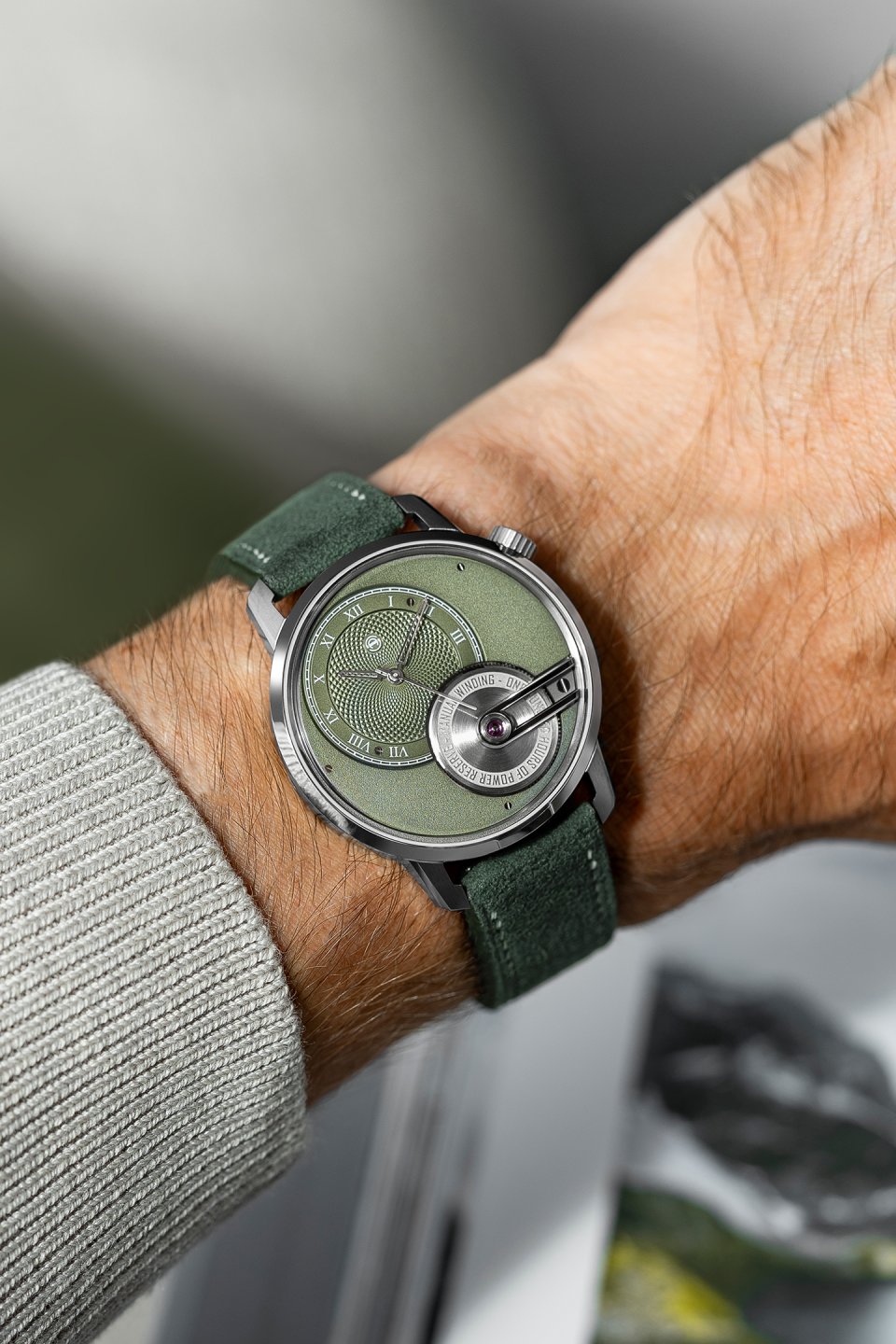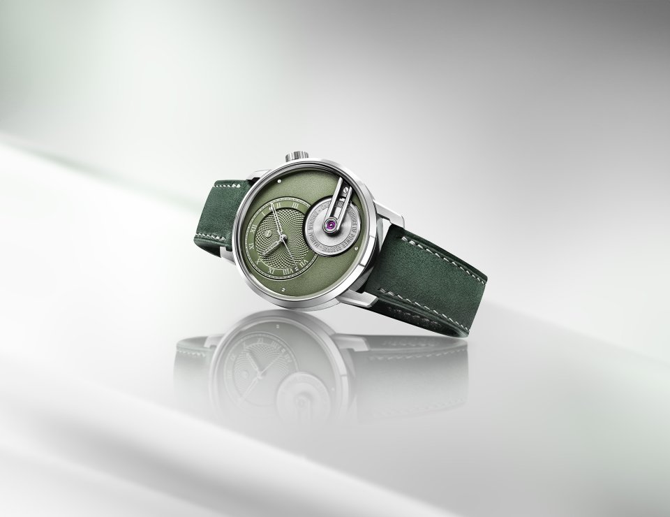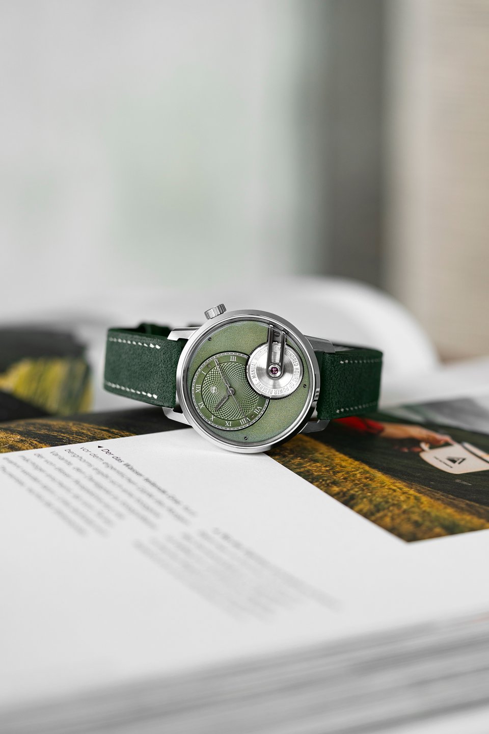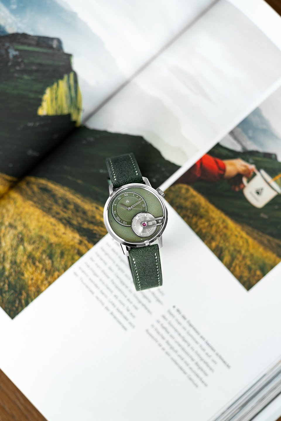 オフセンターのメインダイヤルは、フォレストグリーンに手彫りの「グレイン・ドージュ」ギョーシェ模様を施し、ホワイトのローマ数字をプリント。そこにフロステッド仕上げのサブダイヤルが重なり、奥行きある表情を生み出します。ストラップには同色のアルカンターラを採用し、控えめながらも上質な印象を添えています。