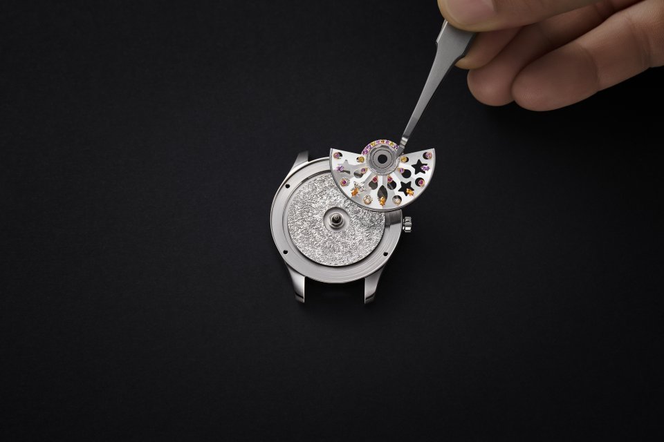 ストーリーを演出するローターは、立体感を高め、かつ、機能性も確保するため3Dで象られ、 複数の透かし彫りを施した、厚みの異なるマザーオブパールのフレームを重ねています。