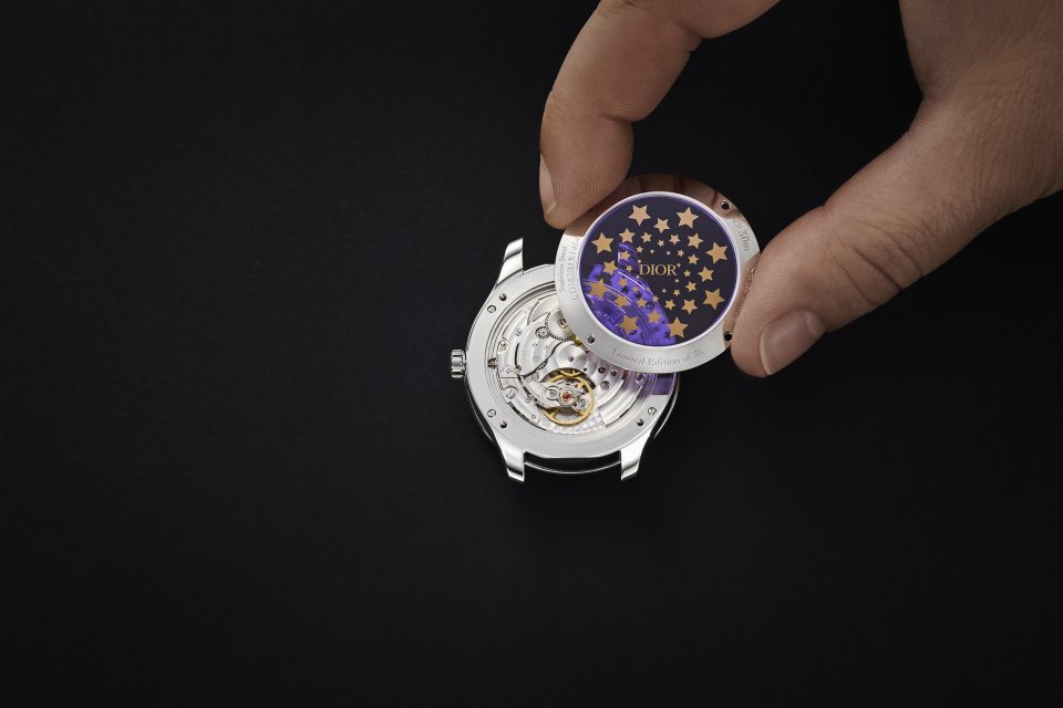 物語りの輝きは時計の裏蓋にまで続いており、シースルーのケースバック全体にピンクゴールド製のメタリックな星モチーフが配されています。