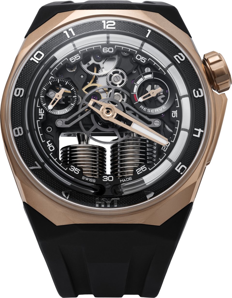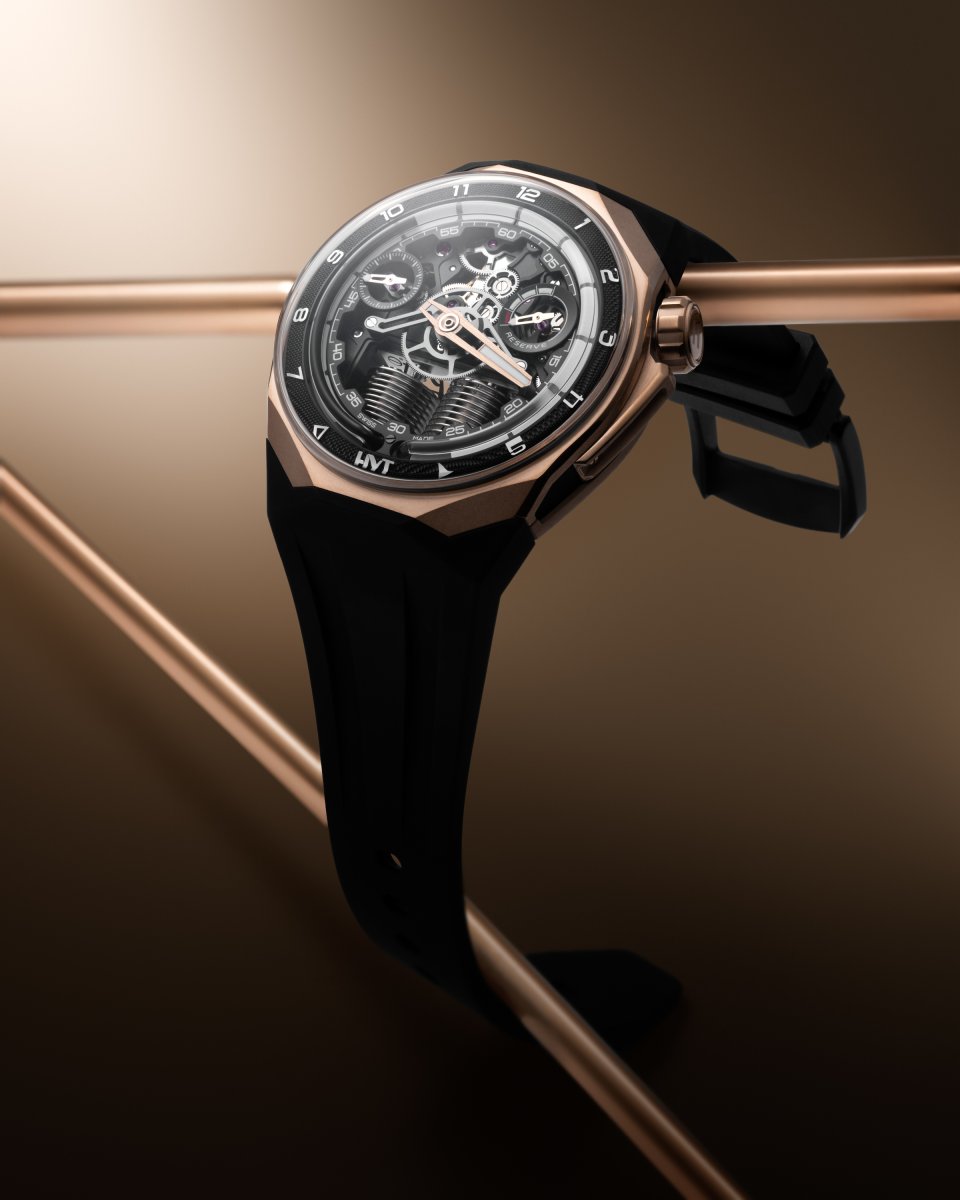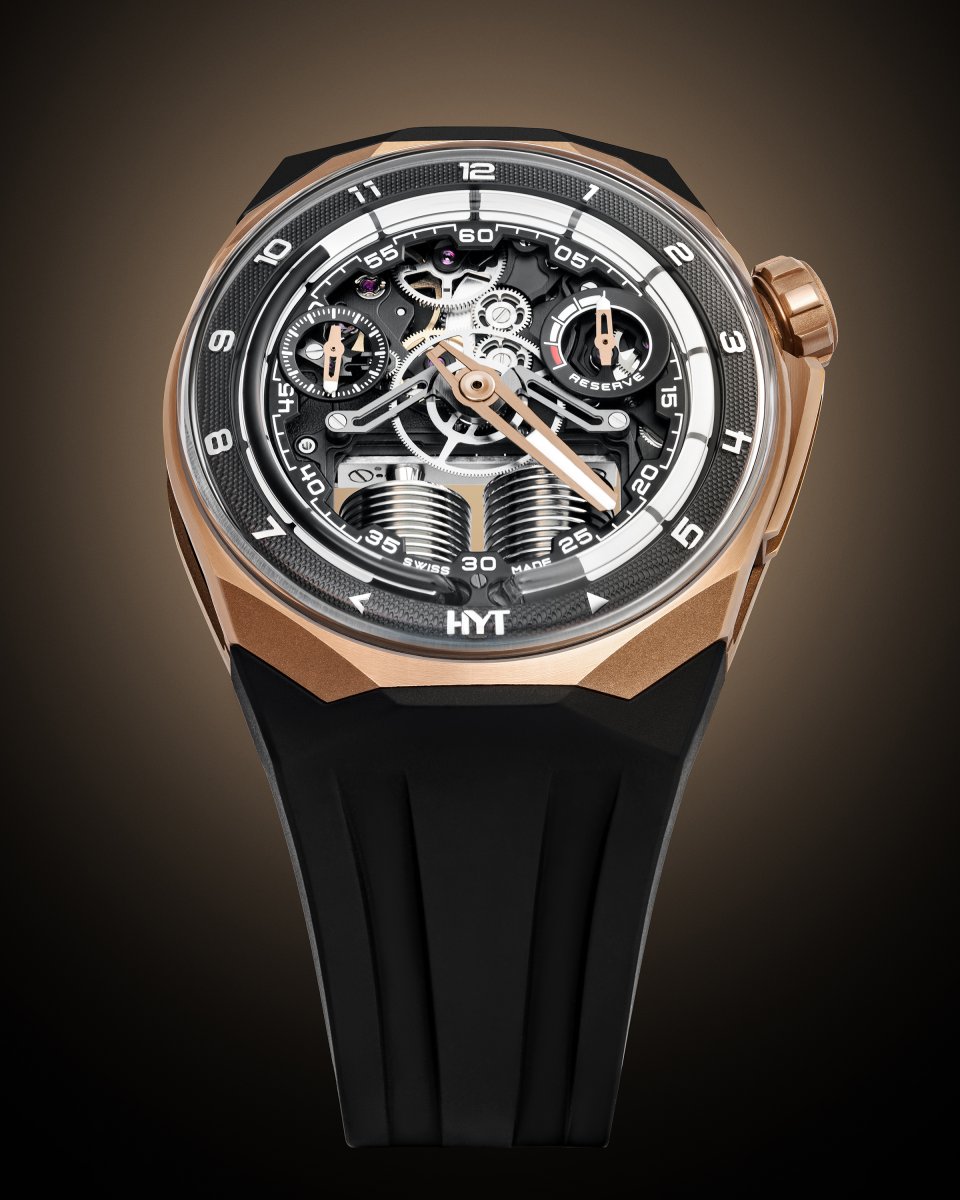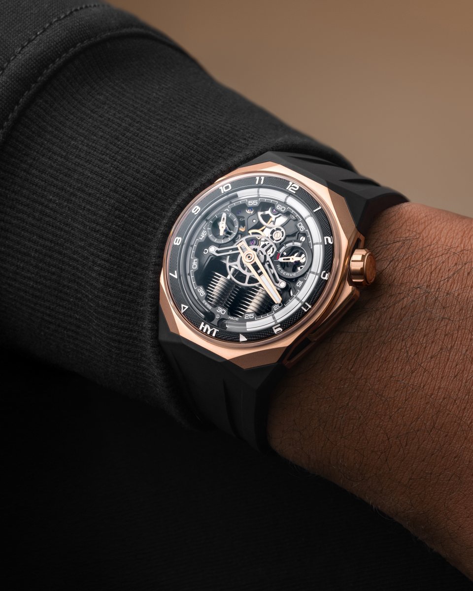 内向的な柔らかな輝きを放つピンクゴールドと控えめなブラックのカラーリングを、エッジの効いた角張ったラインと、大胆で華やかなハイテク機械式ムーブメントと組み合わせたデザインです。この時計は、今後発売されるスポーツウォッチコレクションの先駆けとなる目立つモデルであり、HYTの未来への強い野心を示しています。この時計はまた、HYTの持続可能な能力を象徴しています。新しいタイムピースは、HYTが伝統的な職人技、技術革新、進歩的なデザインを融合させながら、最適な腕の快適性を確保する能力を証明しています。
