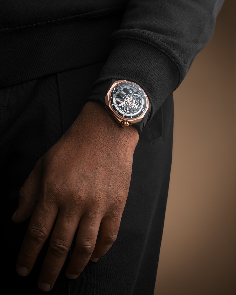 S1 5N ゴールド・チタン リミテッド エディション”Fally Ipupa”は、45mmの5Nゴールドとチタニウム製ブラックDLCケースを採用し、力強いデザインと繊細なサテン仕上げが調和した、人間工学に基づいたデザインを自信を持って披露しています。新モデルのS1のオープンワークダイアルの中心に、ハイドロメカニカルキャリバー501-CMが配置されています。その魅惑的な存在感は目を離せませんが、角張ったケースのピンクゴールドの輝きもまた、注目を集める要素となっています。