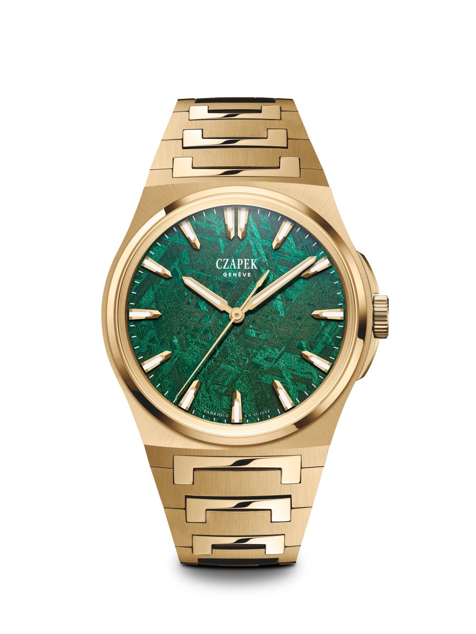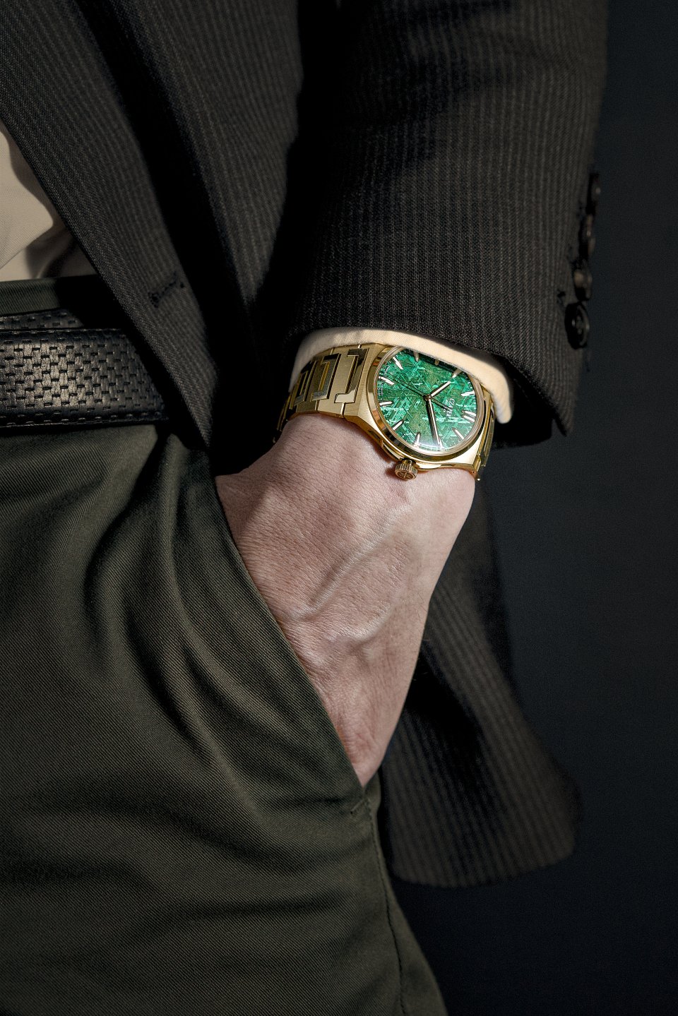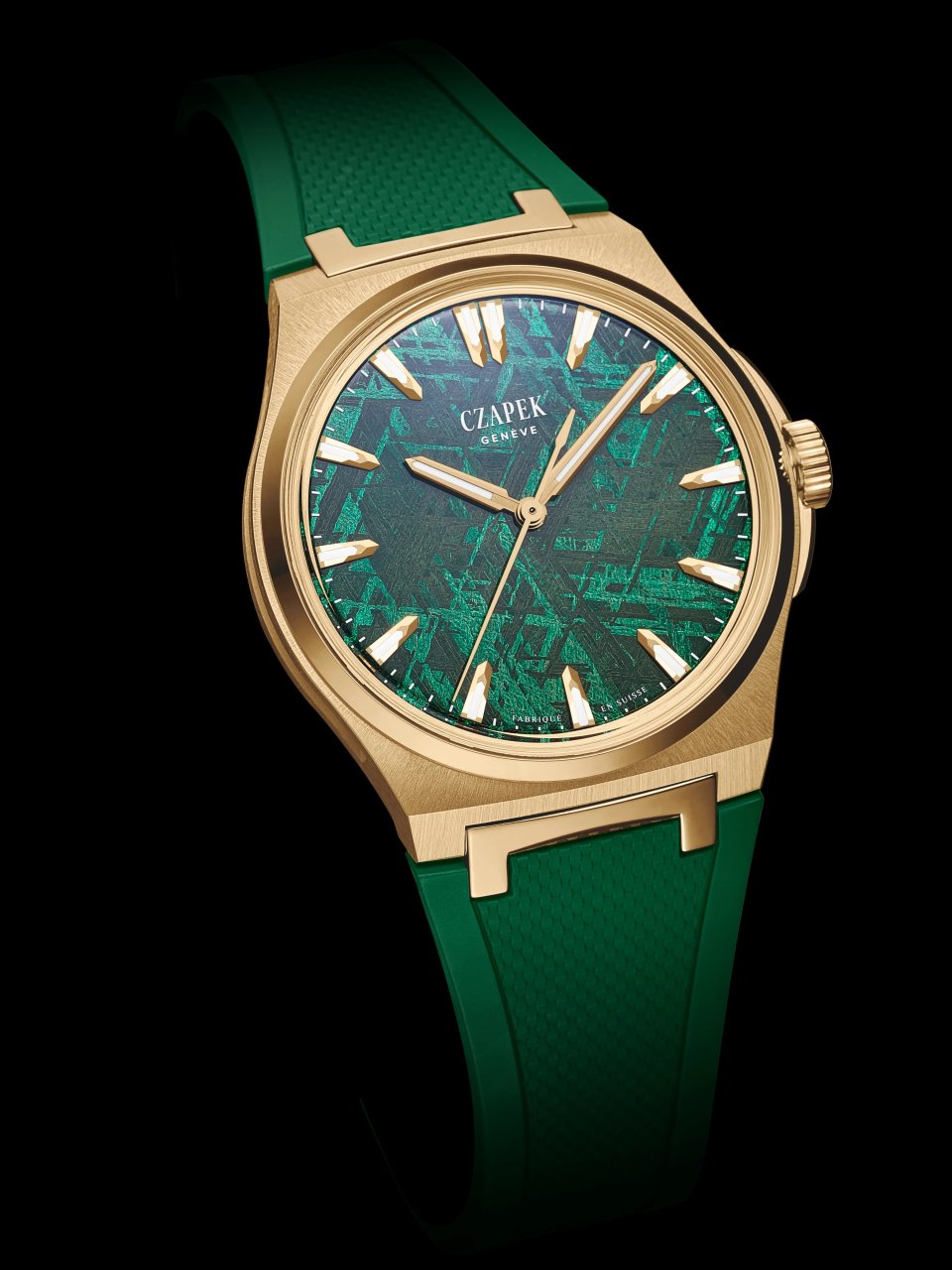 グリーン・メテオの文字盤は石ではなく、ナミビア産のギベオン隕石を用いたもの。酸でエッチングして現れるウィドマンシュテッテン構造に、半透明のグリーンラッカーを重ね、神秘的な奥行きを演出します。スティールケース・バージョンで熱烈な反響を呼んだモデルを、今回はイエローゴールド仕様で発表。緑がかったブルーを帯びていたスティール・バージョンに対し、新作はより暖かみを帯び、2Nイエローゴールドの輝きと見事に調和します。
