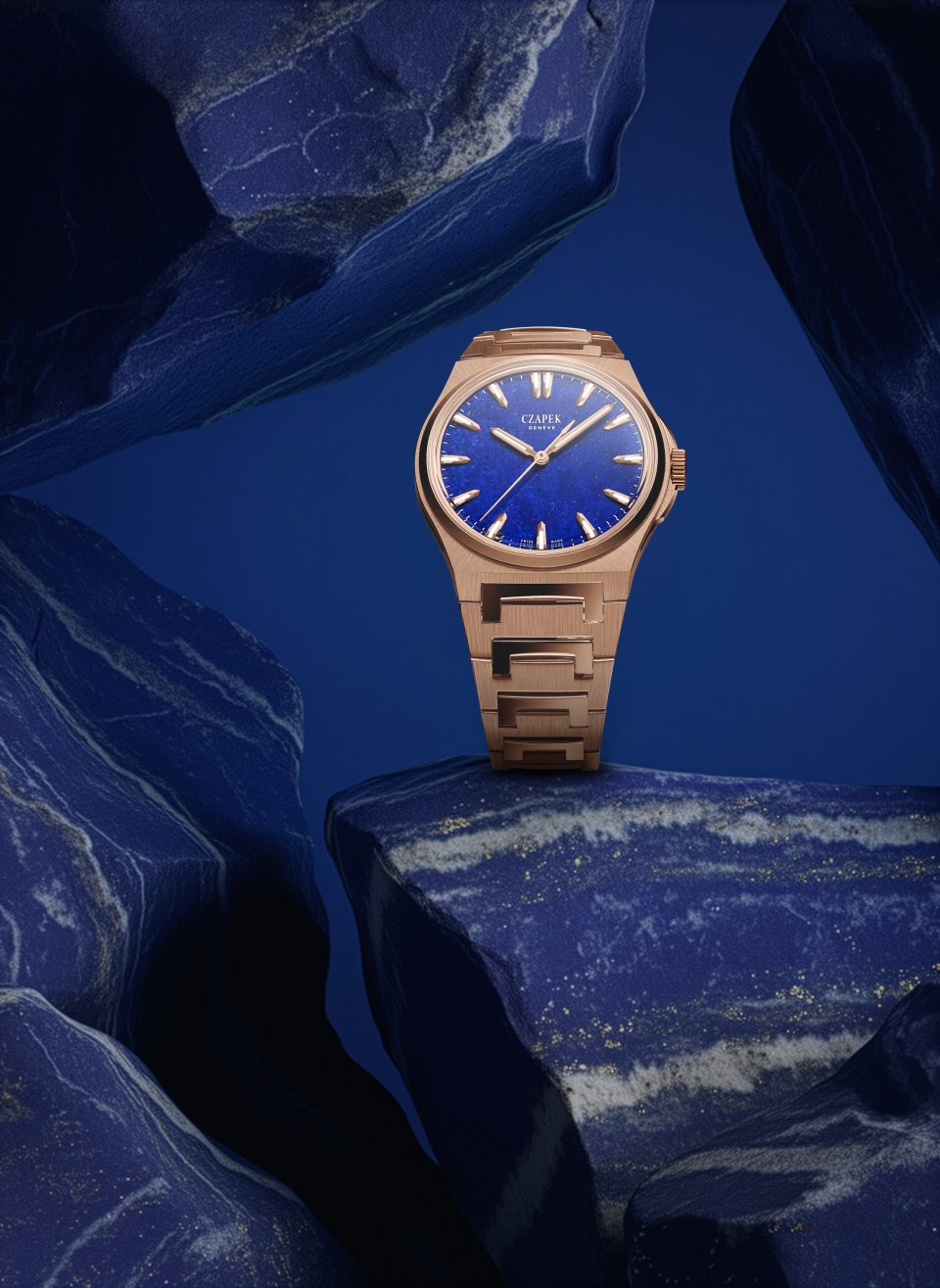 各ストーンダイヤルはそれぞれに個性を持ち、すべてが一点物です。ラピスラズリはアフガニスタンで採掘され、コンフリクトフリー(武装勢力による資金調達や人権侵害に関与せずに採掘・流通された鉱物)で持続可能かつトレーサブルな方法で供給。電気的な深いブルーに金色のパイライトを散りばめたものが厳選され、ローズゴールドの温かみと調和し、時代を超えるエレガンスを生み出します。