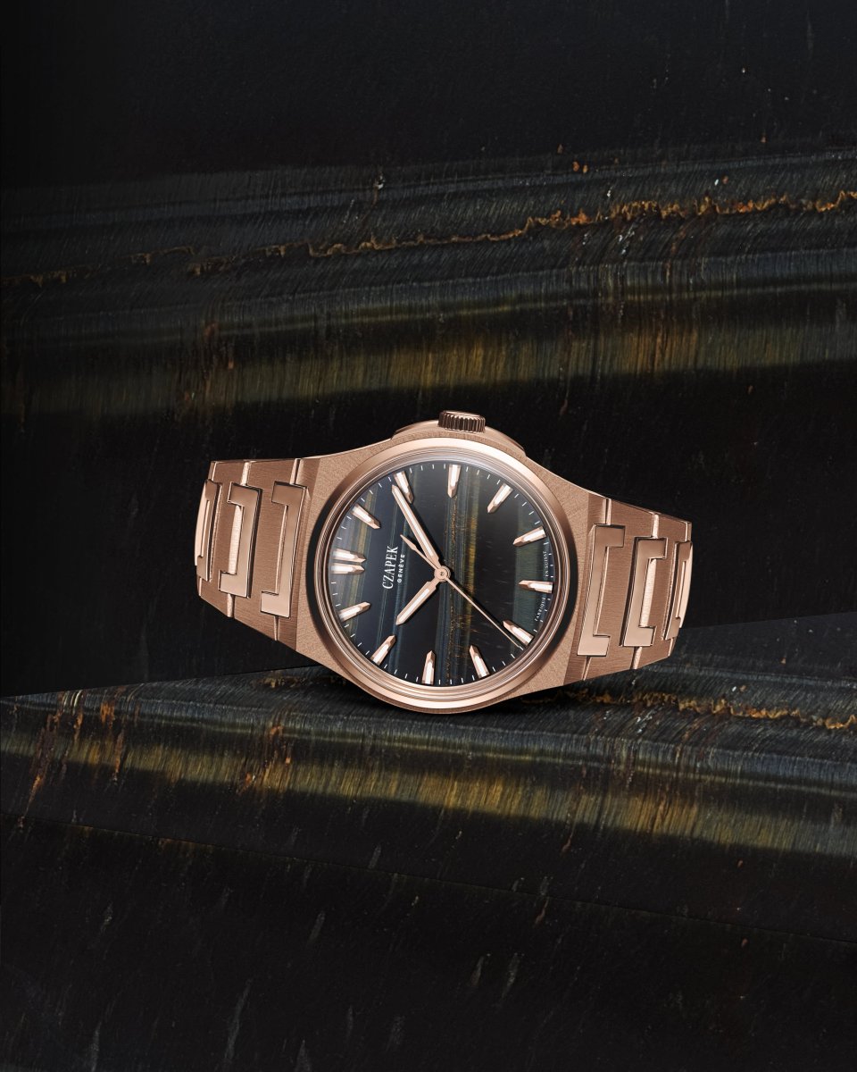ファルコンアイは南アフリカ産で、最も扱いが難しい石のひとつです。青みがかった灰色と金色の光が交錯するその模様は、クロシドライト繊維が石英に置換されることで生まれる微結晶構造によるもの。しかしその構造ゆえに非常に脆く、5枚のダイヤルを切り出しても完璧なものは1枚程度しか得られません。チャペックはあえてオレンジ色の縞や内包物を持つ石を選び取り、「不完全さの中に宿る美」を表現しました。