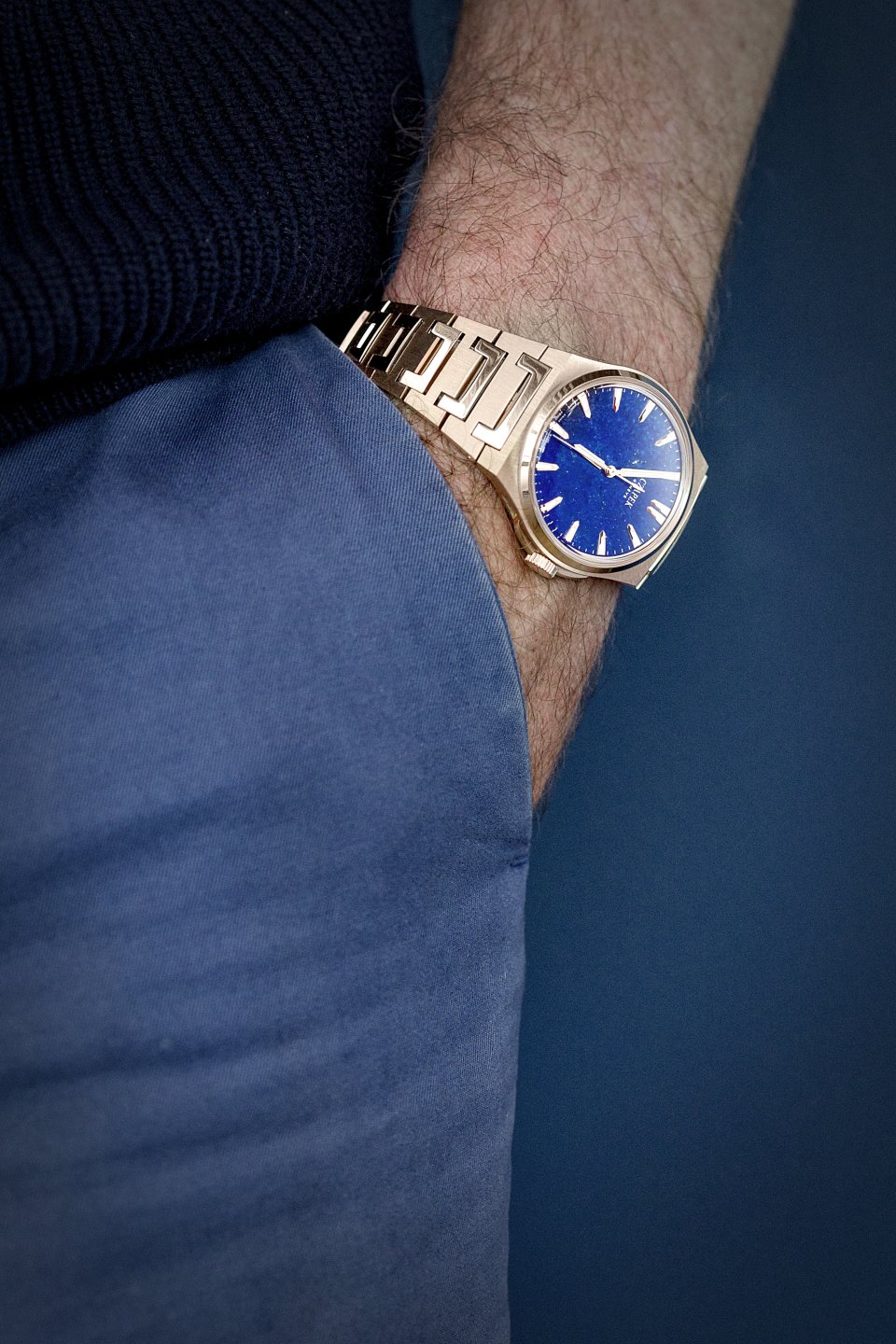 「パートナーであるジェムテックを訪ね、これらの石を初めて原石で見たとき、私はその色彩に心を奪われました。金粉のように煌めくラピスラズリ、光を反射するファルコンアイ、そして隕石の幾何学模様。自然が生み出した芸術を文字盤へと仕立て、ゴールドと石の色彩のコントラストを楽しむことは本当に謙虚な気持ちになります。壊れやすく扱いの難しい素材ですが、そのfragility(はかなさ)こそが唯一無二の生命感を宿すのです。」