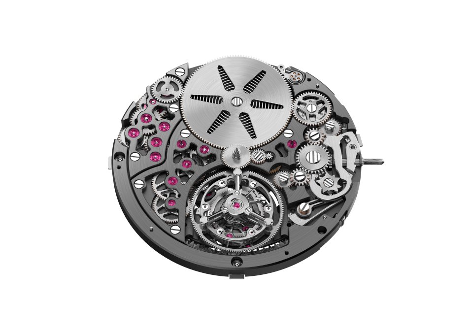 キャリバー4407は、フライバック クロノグラフ、スプリットセコンド、GMT機能、ラージデイトを備えています。中間タイムを計測できるスプリットセコンド機構が、ローターのボールベアリングの厚みに組み込まれており、サファイアケースバック越しに初めて鑑賞できるようになりました。