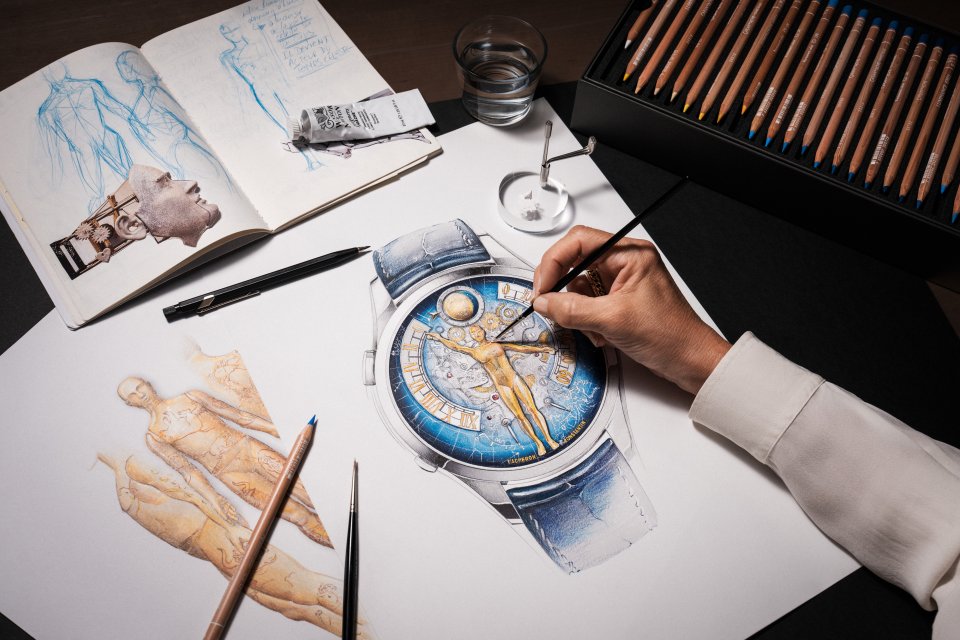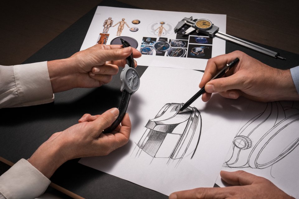 『このタイムピースには、芸術表現を実現する技術とノウハウを注ぎ込み、手仕事による伝統工芸と現代的な装飾技法による仕上げを組み合わせています。その技法は目指す審美性に基づいて選定しました。例えば、チタン製の立体ムーンは、手作業によるエングレービングの後にバイカラーのPVD加工を施しています。チタンを素材とする人物像のモチーフには、18K(3N)イエローゴールド加工を施し、さらに手作業のサンドブラストでパティーナ仕上げを施しています。』
