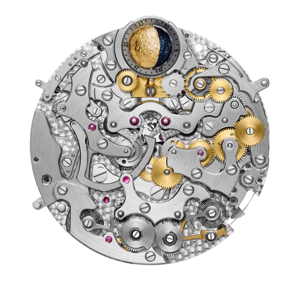 また、月相の周期に伴って変化する月の外観を再現するため、片側はゴールドのPVD加工、暗い側はディープブルーのPVD加工で仕上げています。時・分表示のアーチは18Kホワイトゴールドにオパーリン仕上げを施し、27個の18K(3N)イエローゴールド製アプライド・インデックスを配しています。