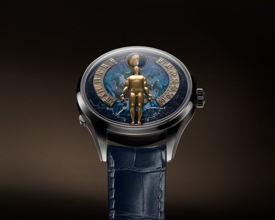 ダイヤルの中央部には、天文学者をモチーフとした「ラ・ケットゥ・デュ・タン」のオートマトンを思わせるゴールドカラーの人物像を配置しています。