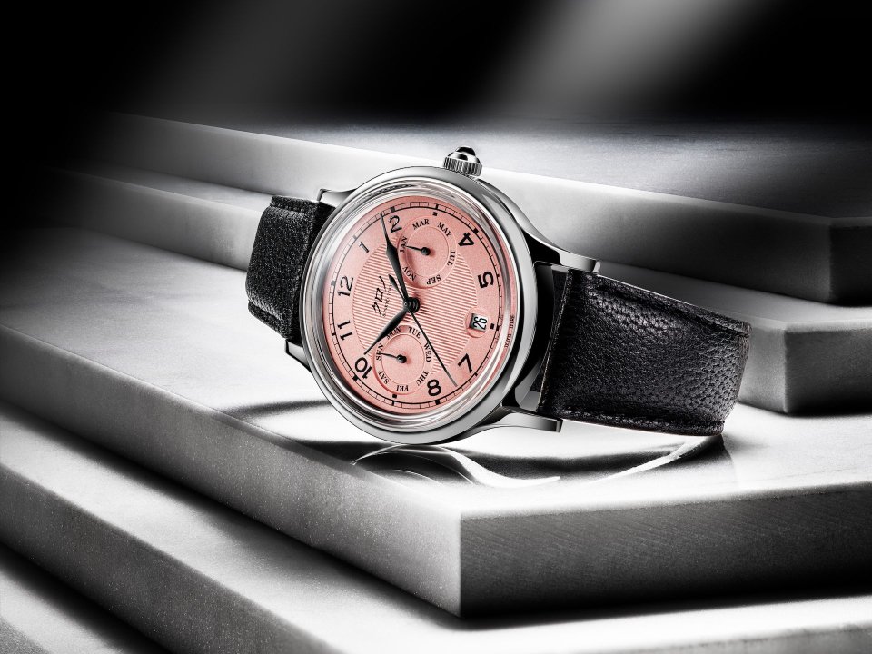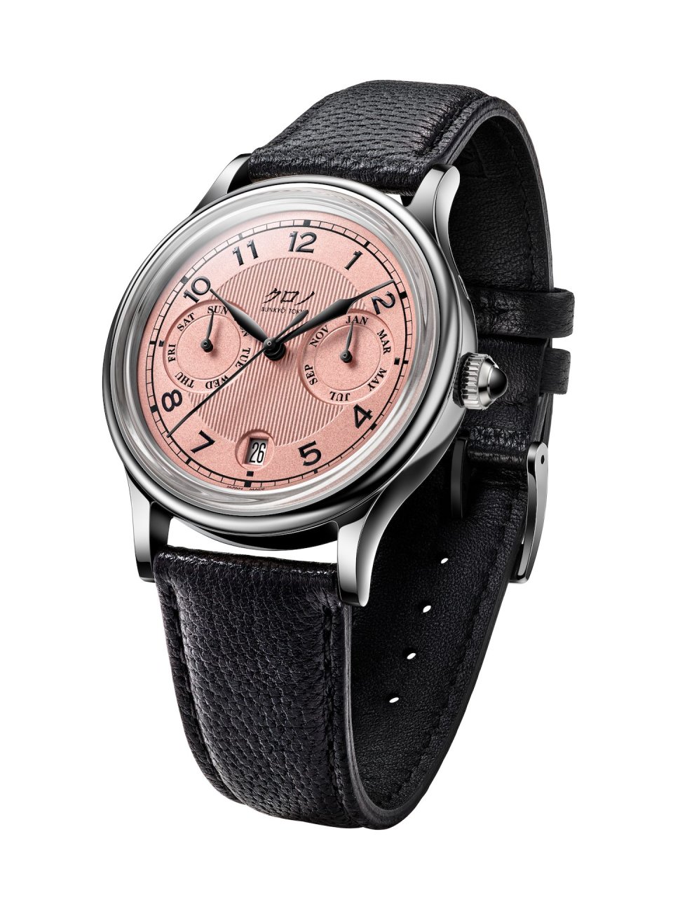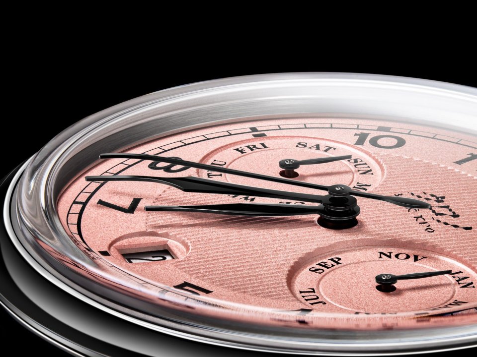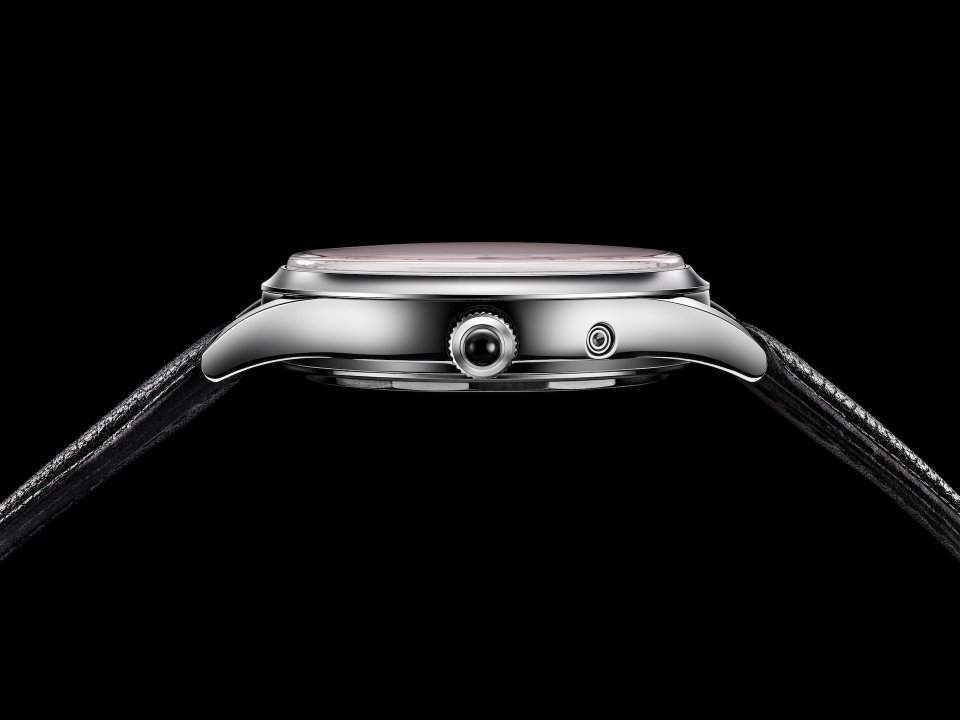 新しいこのデザインでは、日付窓の周囲に丸い窪みを設け、さらにそこに日付窓を開ける事で、文字盤の厚みを実質的に薄く見せる工夫をしています。併せて、文字盤はギョーシェ仕様として、月と曜日表示部分の窪みを形作っています。結果、その奥行きは節度あるものとなって、見応えと見易さが両立できました。それ以外にも、ドレッシーな新しい外装、カボションのオニキスと呼応する黒く着色された針も新しい試みです。