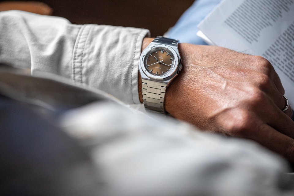 都会的なデザインとスポーツエレガンスを融合。サンレイ仕上げのダイヤルと統合型ブレスレットが上品で現代的な印象を与えます。