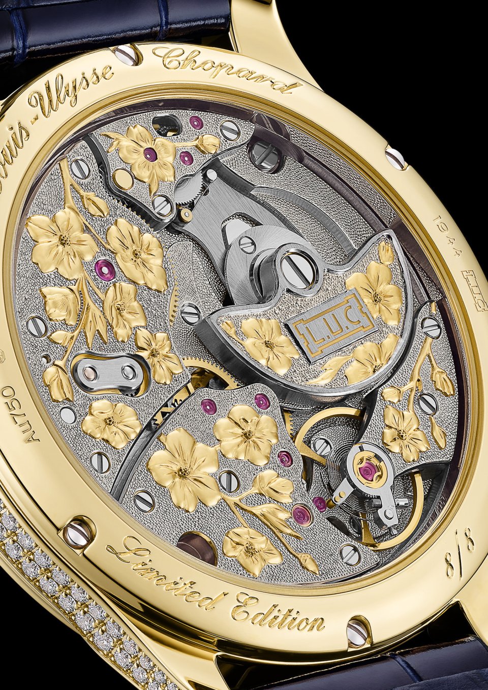 ケースバックから姿を覗かせるムーブメント「L.U.C 96.23-L」は、マニュファクチュールの職人によって受け継がれてきた伝統的なフルリザンヌ彫刻技法を用いて、文字盤と同様に洗練された装飾が施されています。ホワイトゴールド製のブリッジは、精巧に彫り込まれた花の構図を描き出すキャンバスとなり、その中で桜のモチーフが際立ちます。エングレービング後、まずは全体に薄い金箔が施され、花の周囲を丹念に削り取っていきます。さらに周囲の表面にはドット模様を刻み込み、コントラストを生み出すことで、ゴールドをまとった桜の花々だけが浮かび上がります。これにより、洗練されたツートンカラーのムーブメントが誕生し、あらゆる要素がエレガントに引き立てられています。