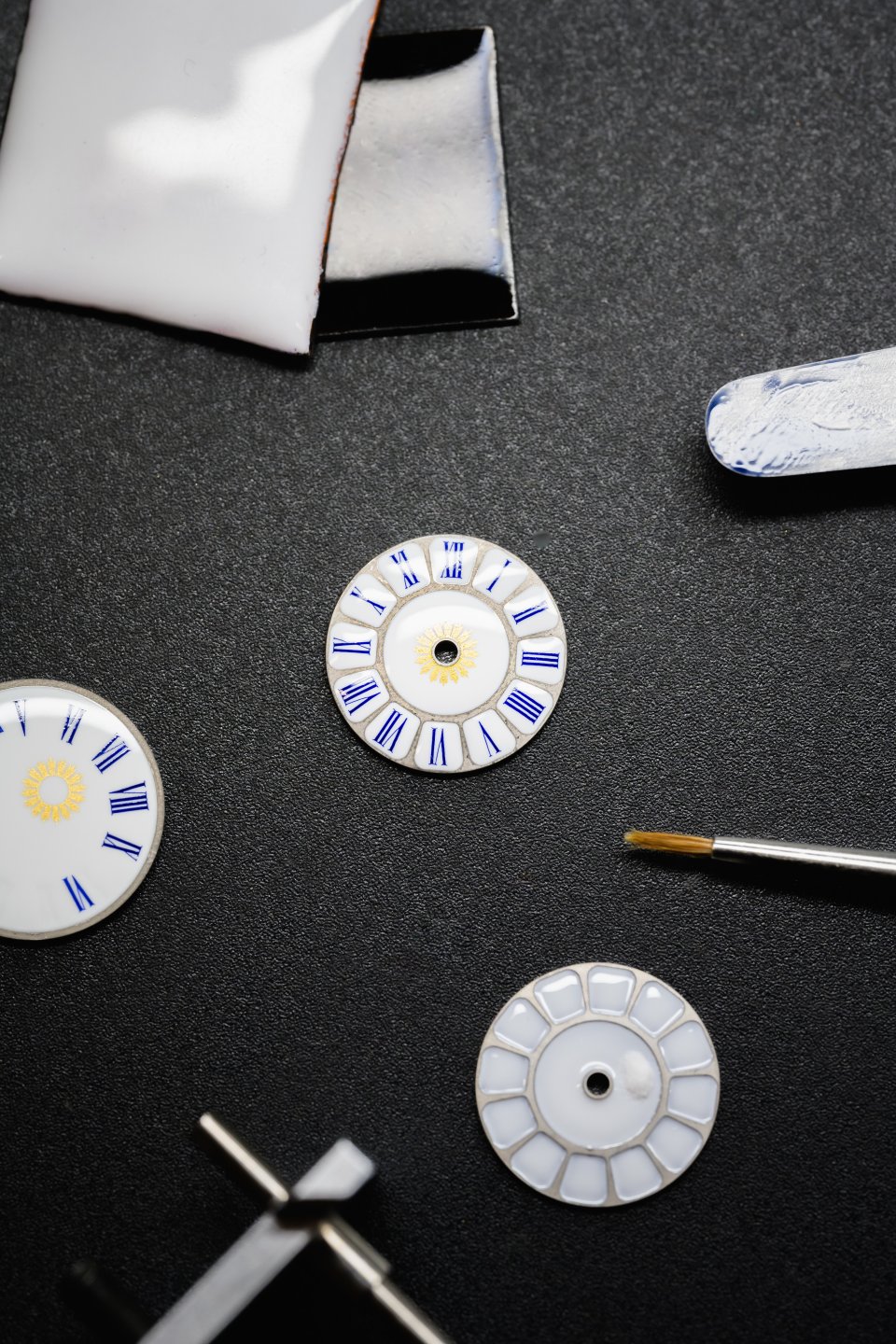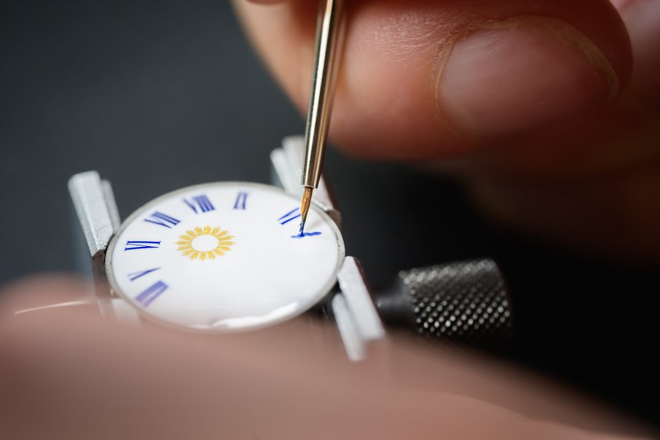この技法により、時計表示ダイヤルの光り輝くホワイトの背景が生み出されています。ブルーエナメルのペイントがローマ数字に使用されており、中央から伸びる太陽の光線を作るために本物の金粉がペイントされています。