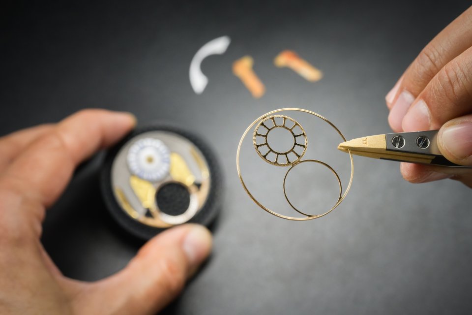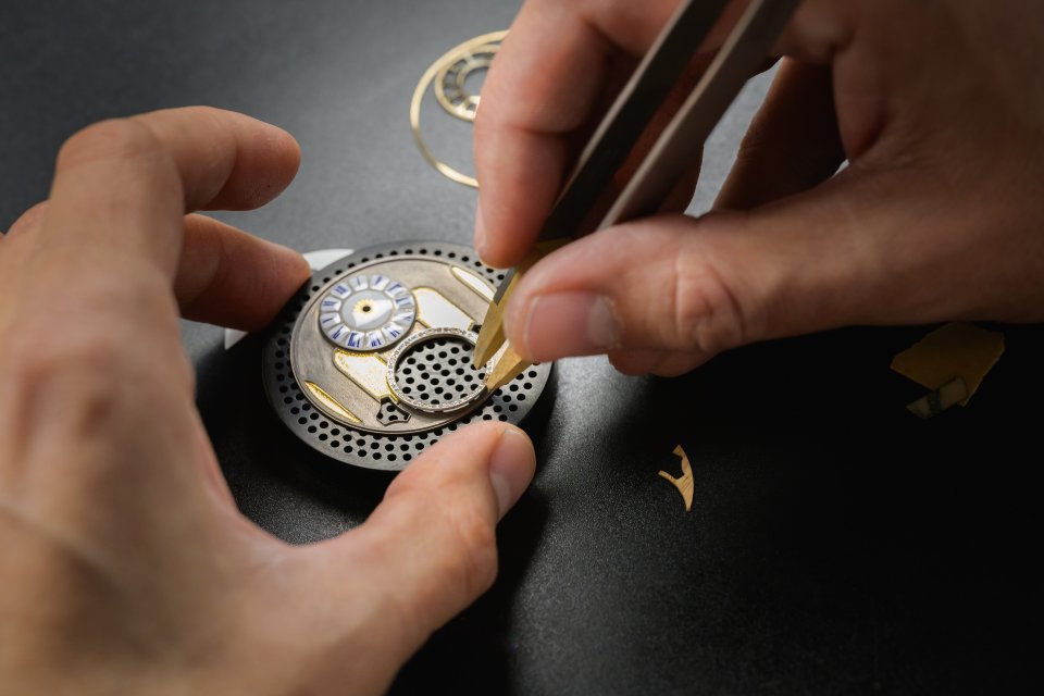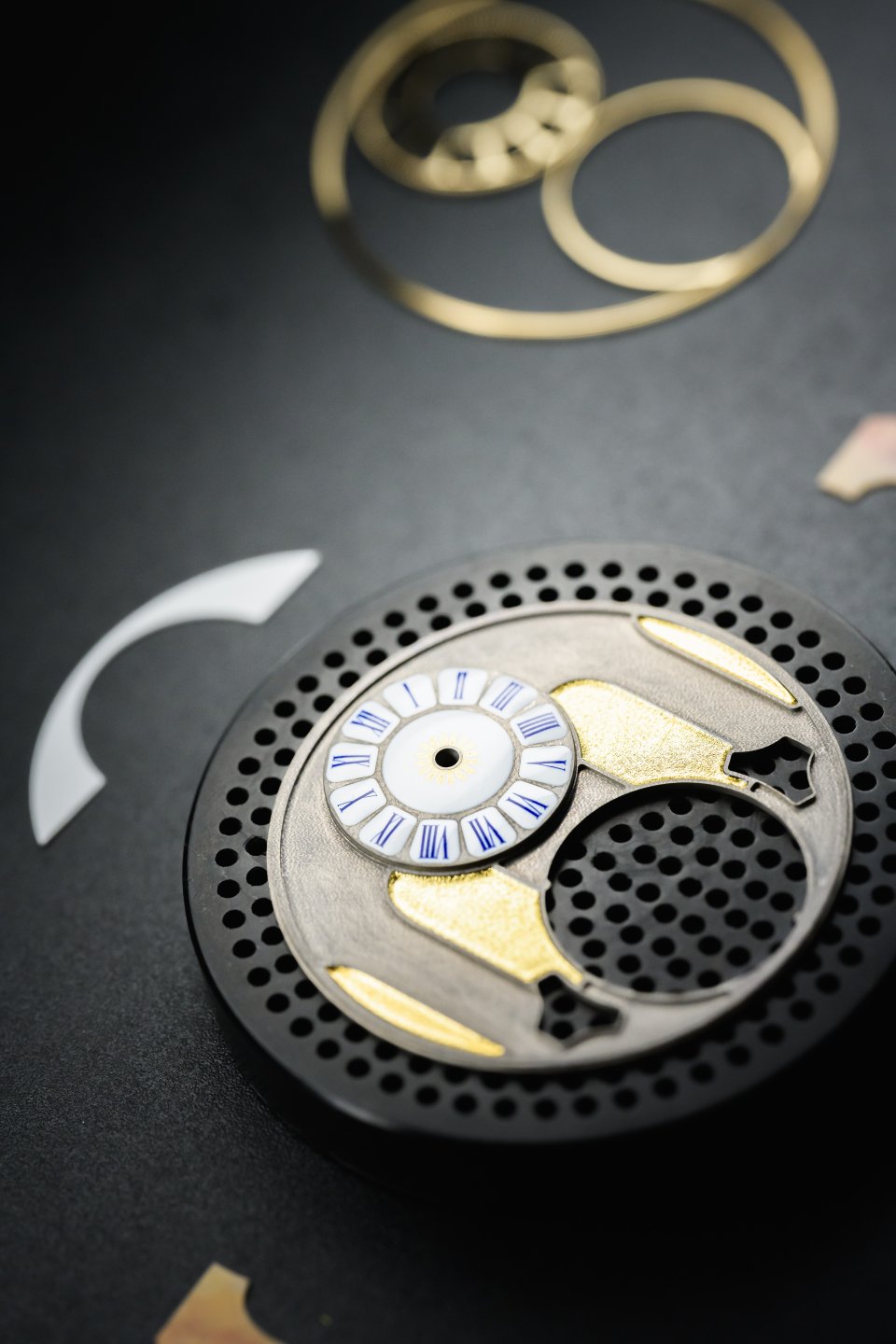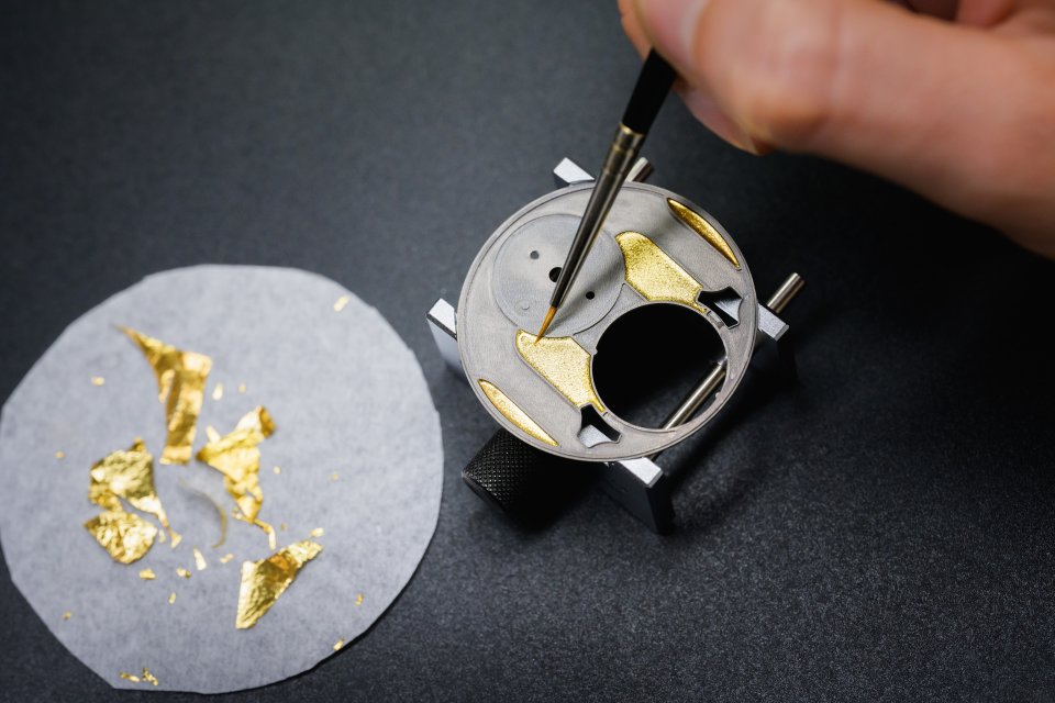 ダイヤルのベースは、Au 750 ホワイトゴールドで作られており、その後ブラックエナメルで覆われ、金箔があしらわれた後、窯で焼かれています。