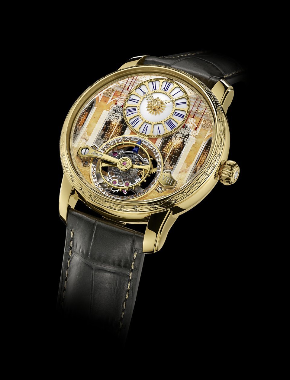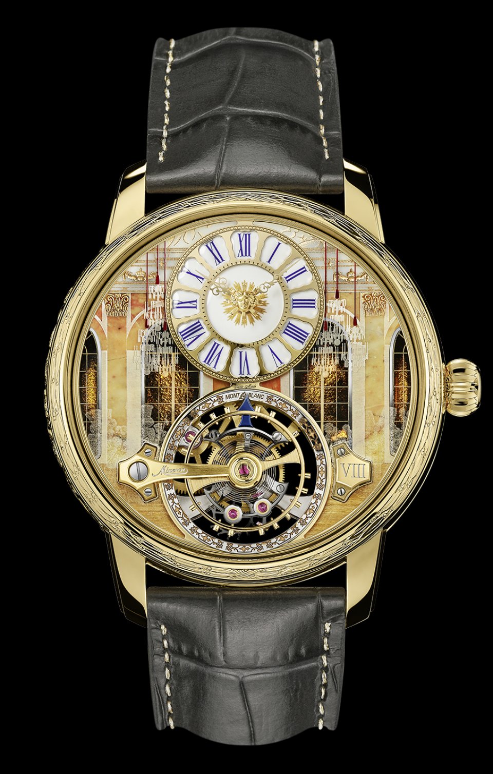 ルイ14世の時代の時計やポケットウオッチにインスパイアされた時計表示ダイヤルが、モンブラン スターレガシー サスペンデッド エグゾ トゥールビヨン シャトー ドゥ ヴェルサイユの豪華な目を惹く特徴として、12時位置に配置されています。