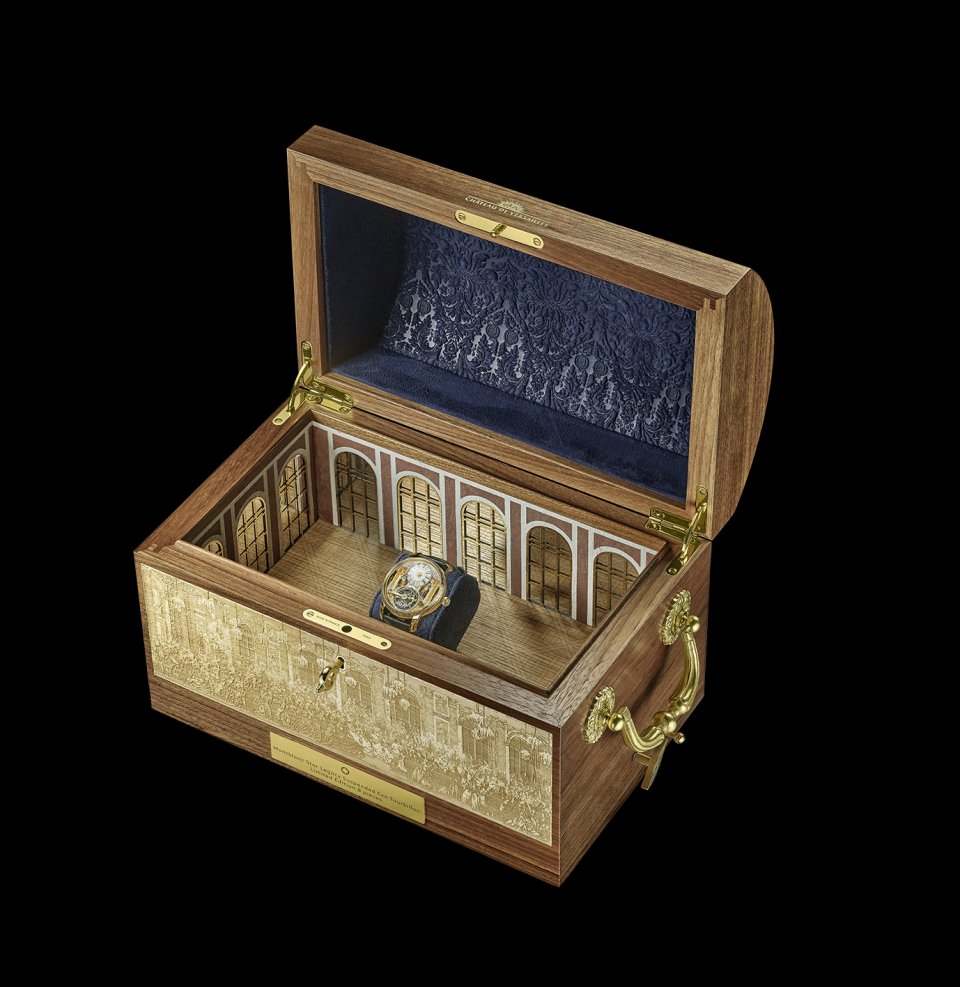 モンブラン スターレガシー サスペンデッド エグゾ トゥールビヨン シャトー ドゥ ヴェルサイユが収められているボックスは、1976年以来運営しているパリの高級アクセサリーメーカー Elie Bleu が作りました。オルゴールの内部は、1865年以来高級オルゴールや機械式鳴き鳥を専門としているスイスの Reuge によるものです。小箱が奏でる音楽は、1745年2月の歴史に名高い夜に、ルイ王太子と花嫁の結婚式を祝福してヴェルサイユ宮殿で披露されました。音楽は、ジャン=フィリップ・ラモーによるもので、歌詞は元々なんとボルテールによって書かれたものです。