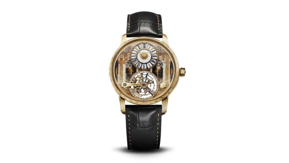 このダイヤルの上にはレーザー機械加工の3Nゴールドのサポートリングが配置されており、ヴェルサイユ宮殿の「鏡の間」の光沢のある真ちゅう製の飾りを模した装飾的なフレーム構造になっています。トゥールビヨンを囲むフレームは、ヴェルサイユ宮殿の「礼拝堂」に見られるフルール・ド・リスを含み、ステンドグラスのモチーフを再現しています。