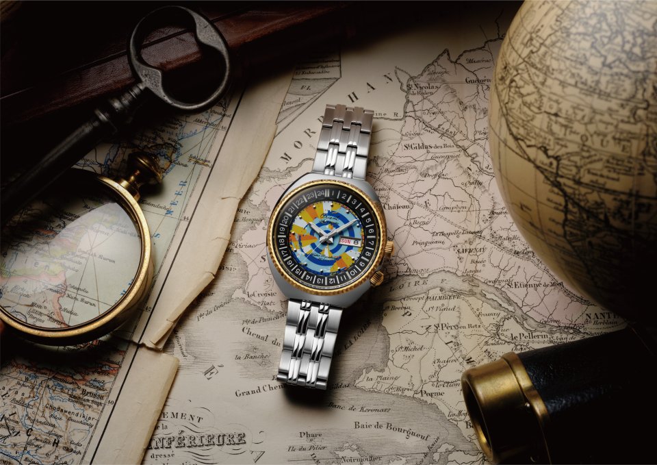 レトロ感あふれる『ワールドマップ』は、まさにオリエントの歴史と時代を語るモデルのひとつです。原型となったのは1969年発売の『ワールドダイバー』[註1]。この時計は日本人の海外渡航が自由化された1964年に発売された伝説の希少モデル『カレンダーオートオリエント スイマー ワールドトリップ(注1)』の後継機として考案され、ダイバーズウォッチとトラベルウォッチの特長をオリエントならではのユニークなスタイルで表現したものでした。ケース4時位置のりゅうずで操作する24時間表示内転リングを文字板に描かれた南半球から見た世界地図に合わせることで各地のおおよその時刻が把握できる簡易ワールドタイム機能には、海外旅行への憧れが象徴されていました。