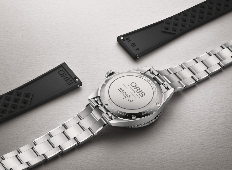 ・裏蓋:ステンレススチール製(ねじ込み式)、「Oris x RedBar」特別刻印入り