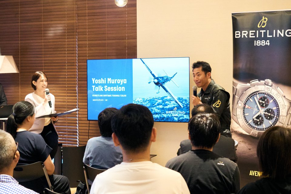 テープカットセレモニーに続き、特別にご招待した顧客向けに、室屋義秀氏によるトークイベントを開催。 ブライトリングとの出会いから今日に至るまでの長年にわたるパートナーシップ、パイロットにとっての時計の意義、そして最終戦を終えたばかりのエアレースXや後進育成など、現在取り組まれている活動について語っていただきました。 さらに、発表に先駆けて、ブライトリングとのパートナーシップモデル「クラシック アヴィ クロノグラフ 42 室屋義秀 リミテッド エディション」を特別展示。 ご自身の視点から、本モデルに込められた魅力とこだわりを存分にご紹介いただきました。